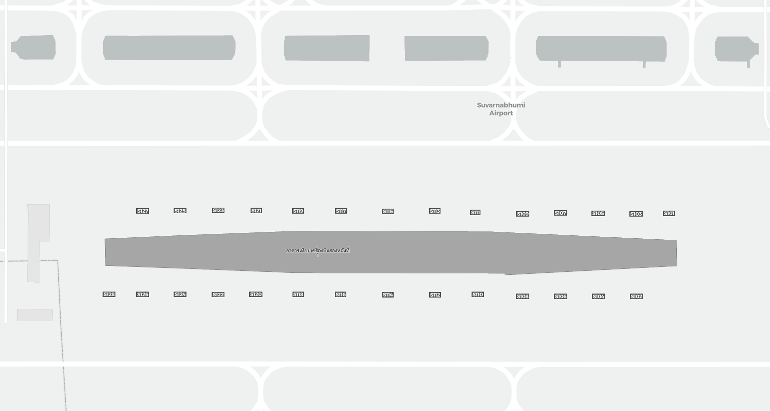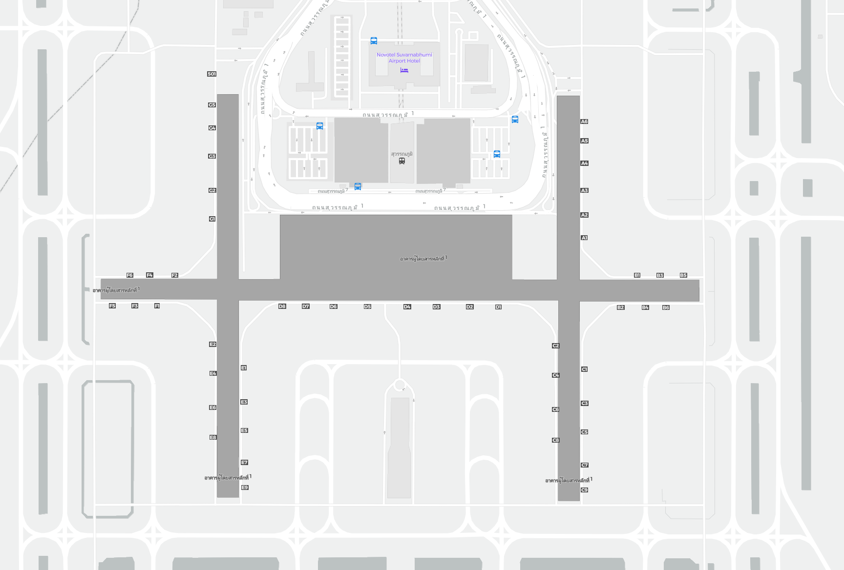 Detta är en zoombar karta över Bangkok (BKK). Kartan visar utomhusområden med terminaler och parkeringar och – på vissa flygplatser – även detaljer om gate-områden, hyrbilsanläggningar och andra faciliteter när du zoomar in.