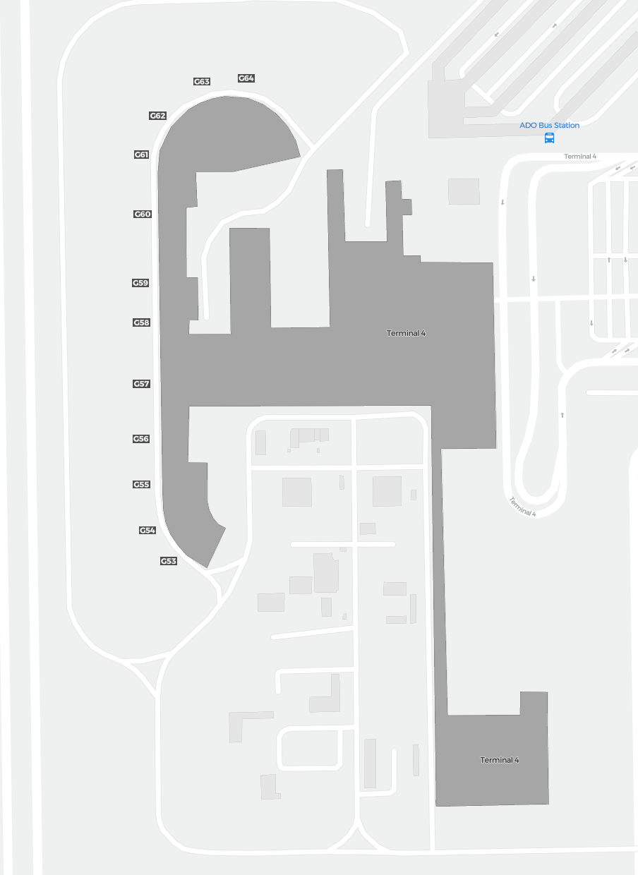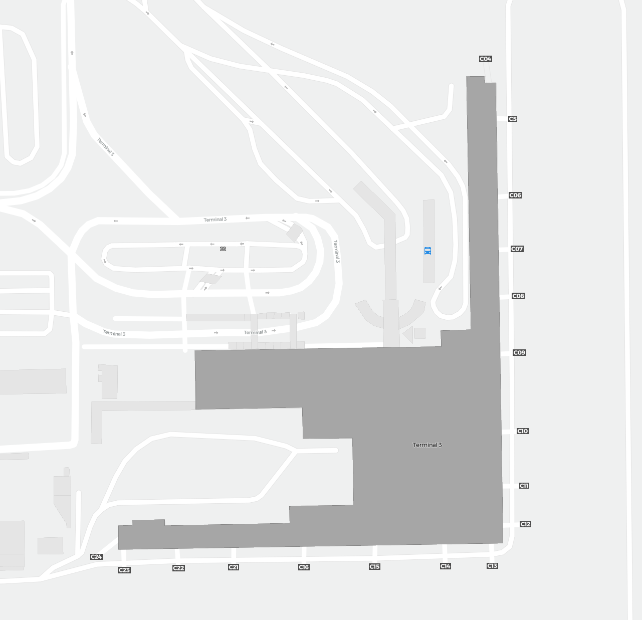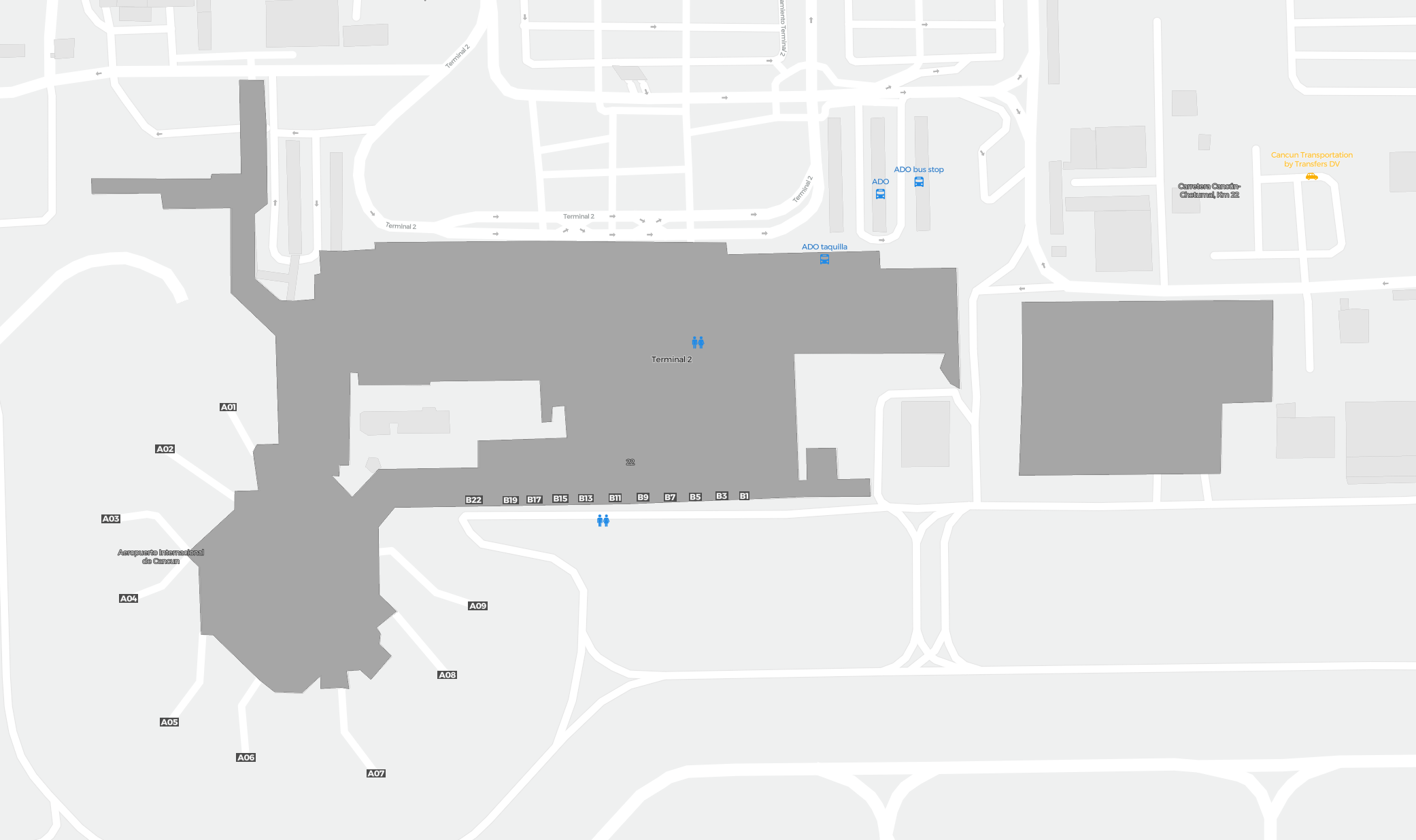 Detta är en zoombar karta över Cancún (CUN). Kartan visar utomhusområden med terminaler och parkeringar och – på vissa flygplatser – även detaljer om gate-områden, hyrbilsanläggningar och andra faciliteter när du zoomar in.