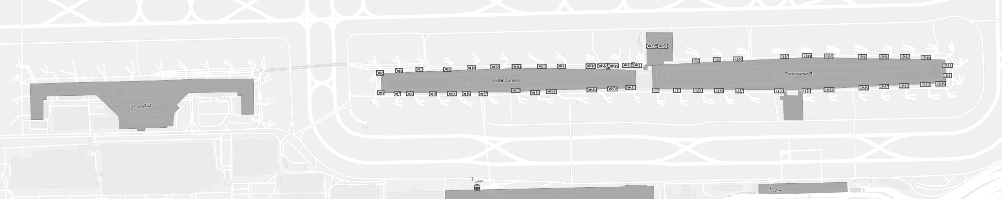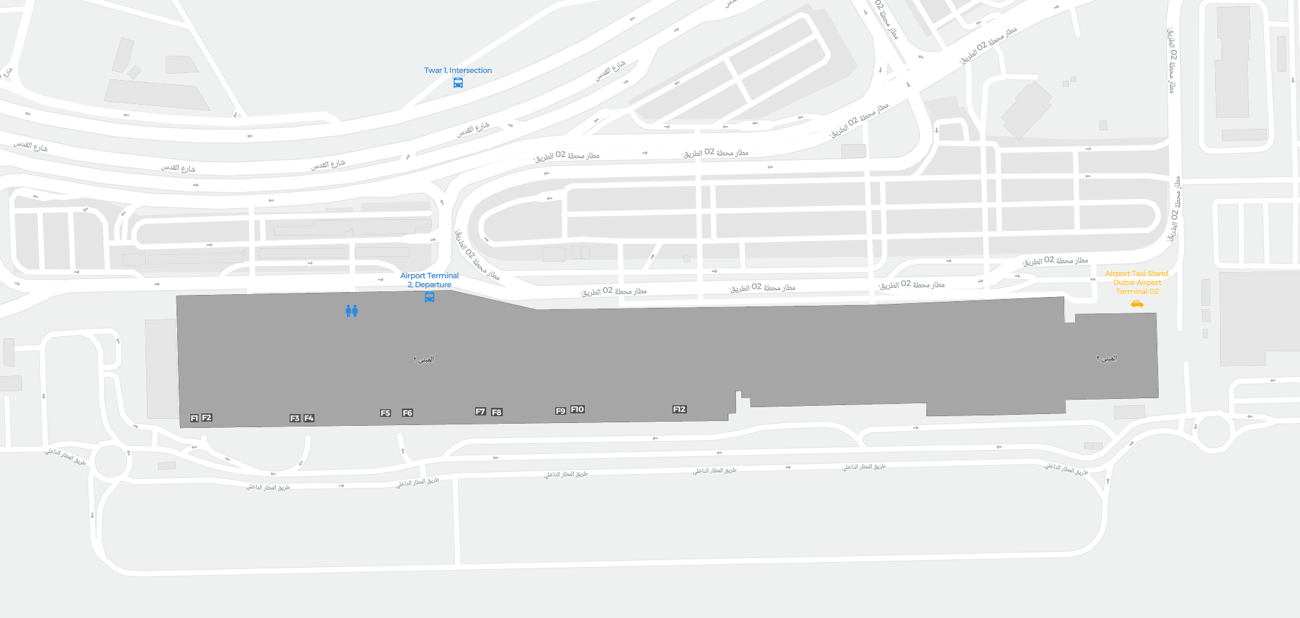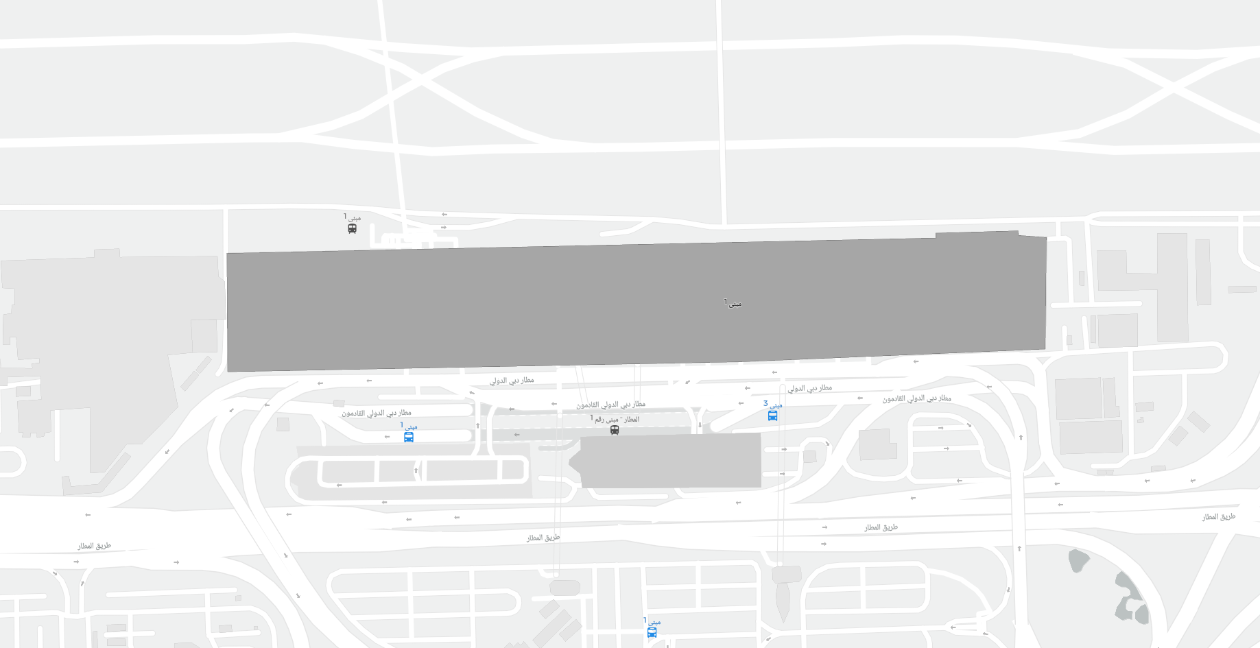 Detta är en zoombar karta över Dubai (DXB). Kartan visar utomhusområden med terminaler och parkeringar och – på vissa flygplatser – även detaljer om gate-områden, hyrbilsanläggningar och andra faciliteter när du zoomar in.