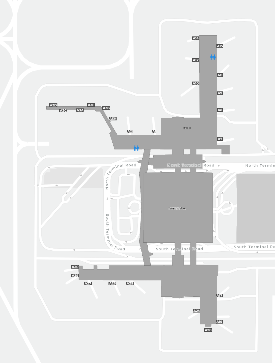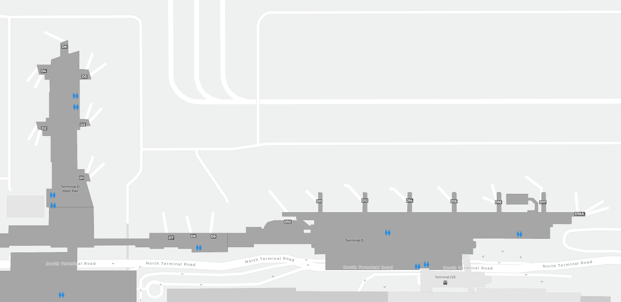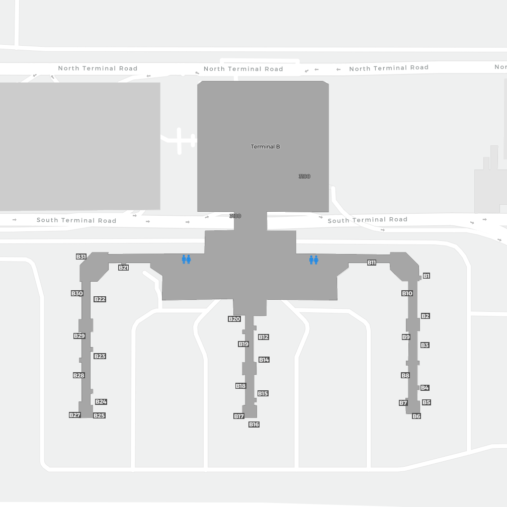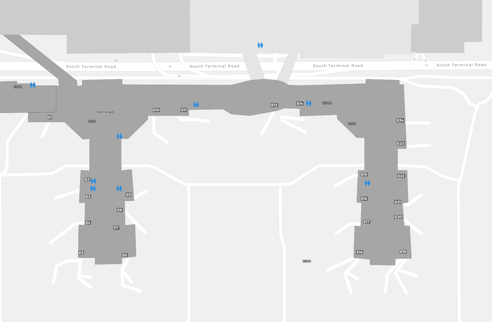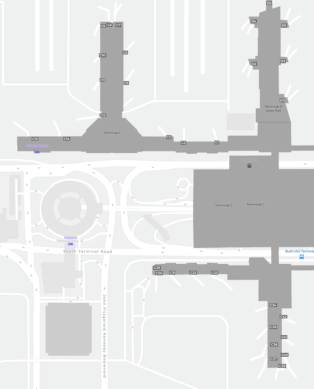 Detta är en zoombar karta över Houston (IAH). Kartan visar utomhusområden med terminaler och parkeringar och – på vissa flygplatser – även detaljer om gate-områden, hyrbilsanläggningar och andra faciliteter när du zoomar in.
