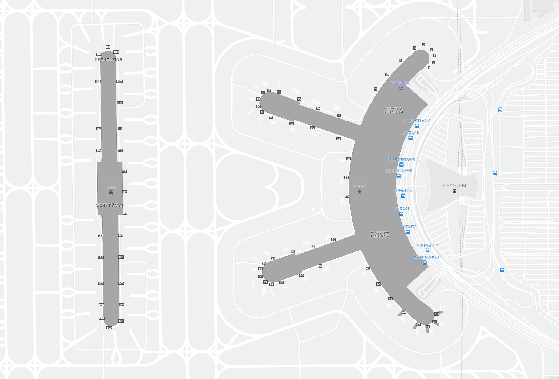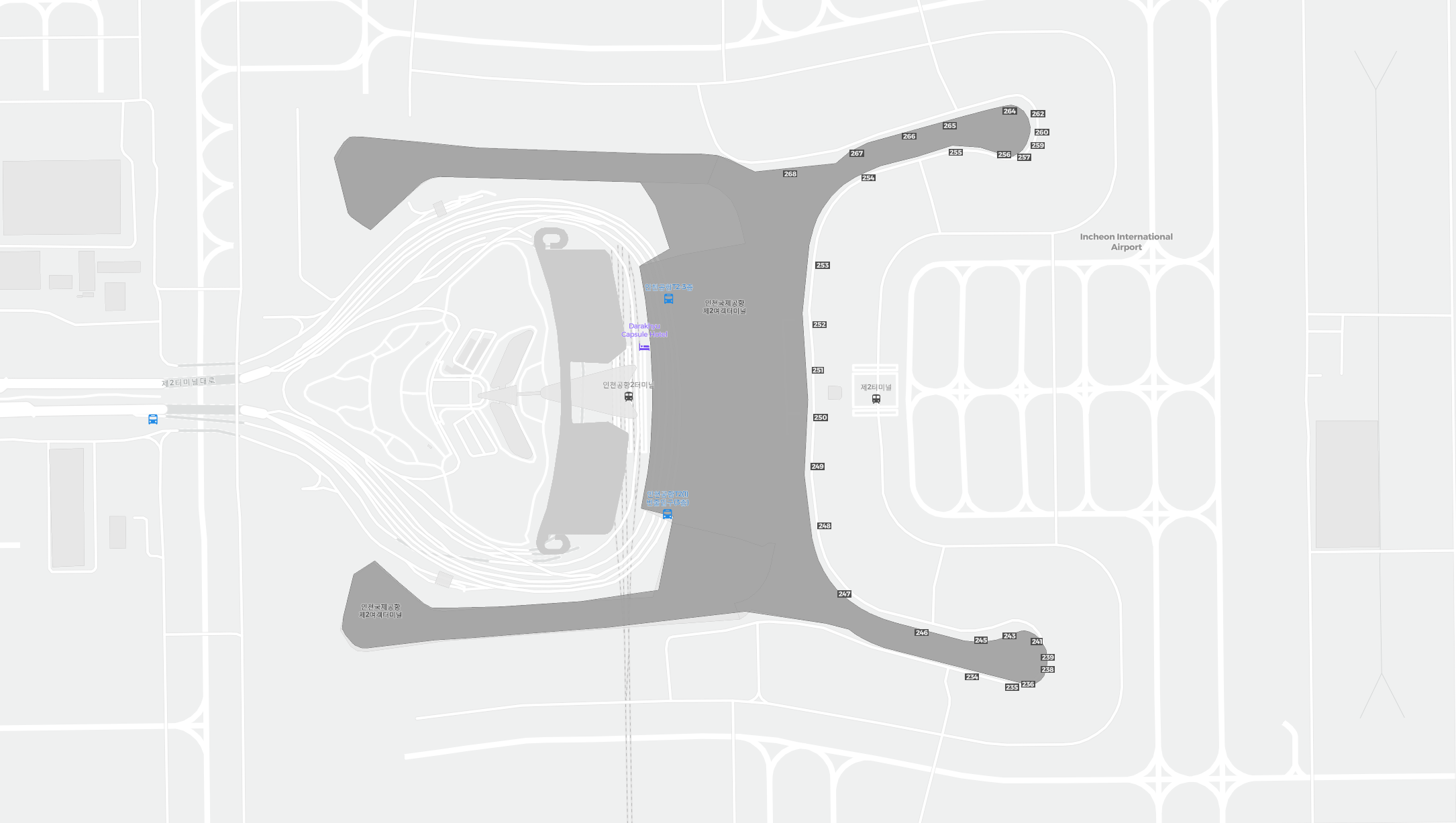 Detta är en zoombar karta över Inchon (ICN). Kartan visar utomhusområden med terminaler och parkeringar och – på vissa flygplatser – även detaljer om gate-områden, hyrbilsanläggningar och andra faciliteter när du zoomar in.
