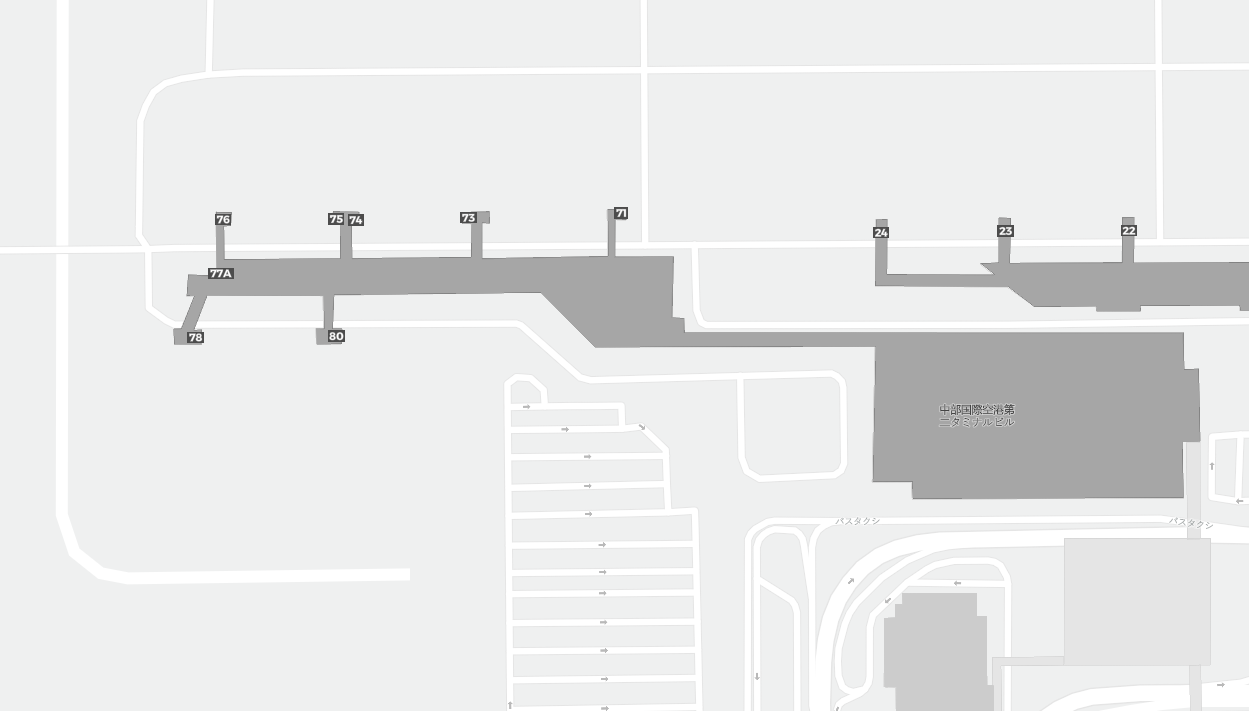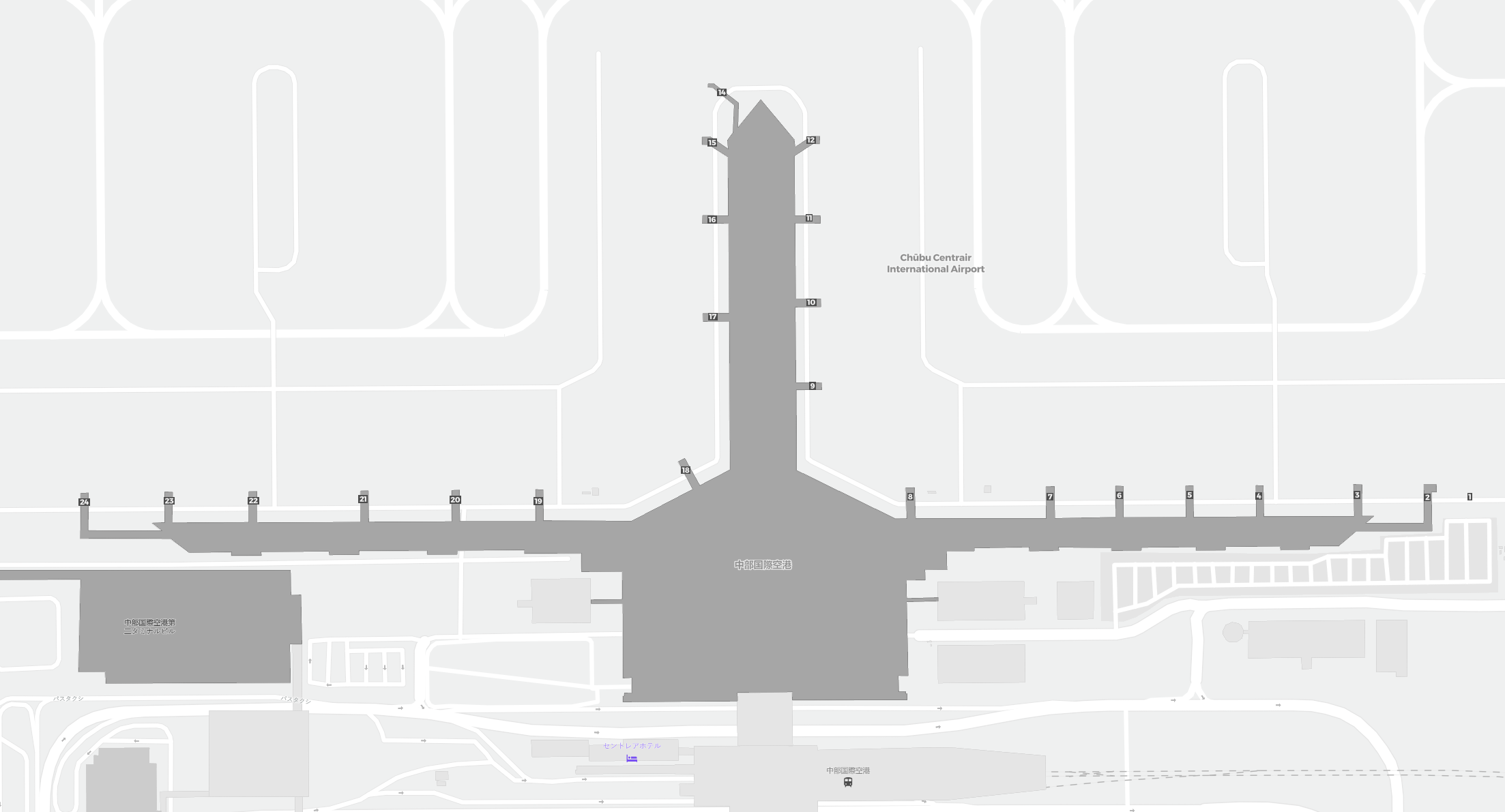 Detta är en zoombar karta över Nagoya (NGO). Kartan visar utomhusområden med terminaler och parkeringar och – på vissa flygplatser – även detaljer om gate-områden, hyrbilsanläggningar och andra faciliteter när du zoomar in.