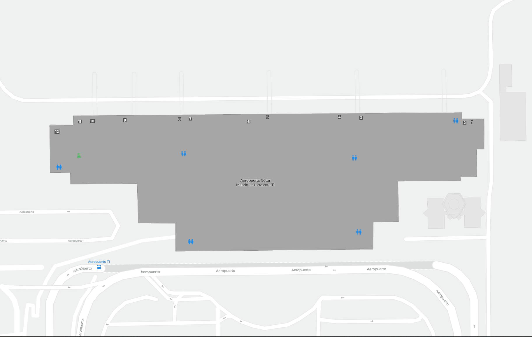 Detta är en zoombar karta över Arrecife (ACE). Kartan visar utomhusområden med terminaler och parkeringar och – på vissa flygplatser – även detaljer om gate-områden, hyrbilsanläggningar och andra faciliteter när du zoomar in.