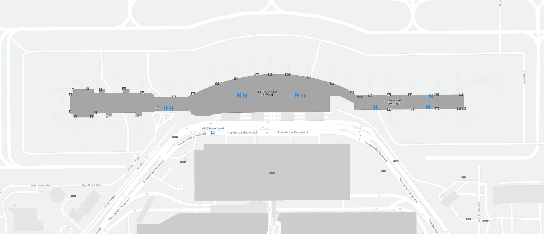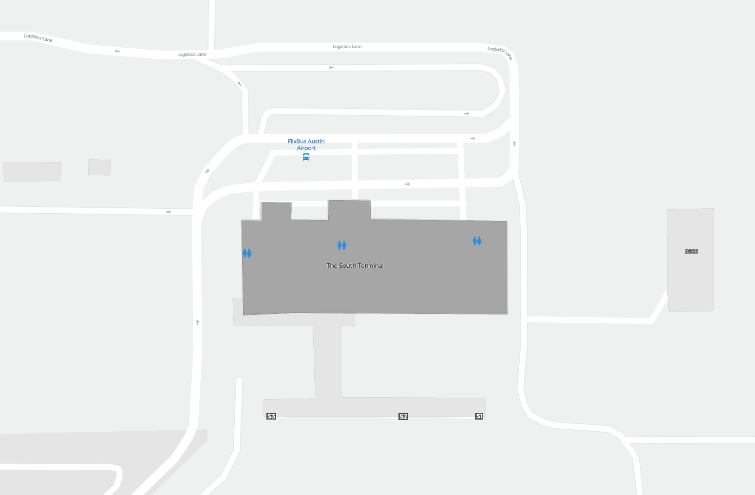 Detta är en zoombar karta över Austin (AUS). Kartan visar utomhusområden med terminaler och parkeringar och – på vissa flygplatser – även detaljer om gate-områden, hyrbilsanläggningar och andra faciliteter när du zoomar in.