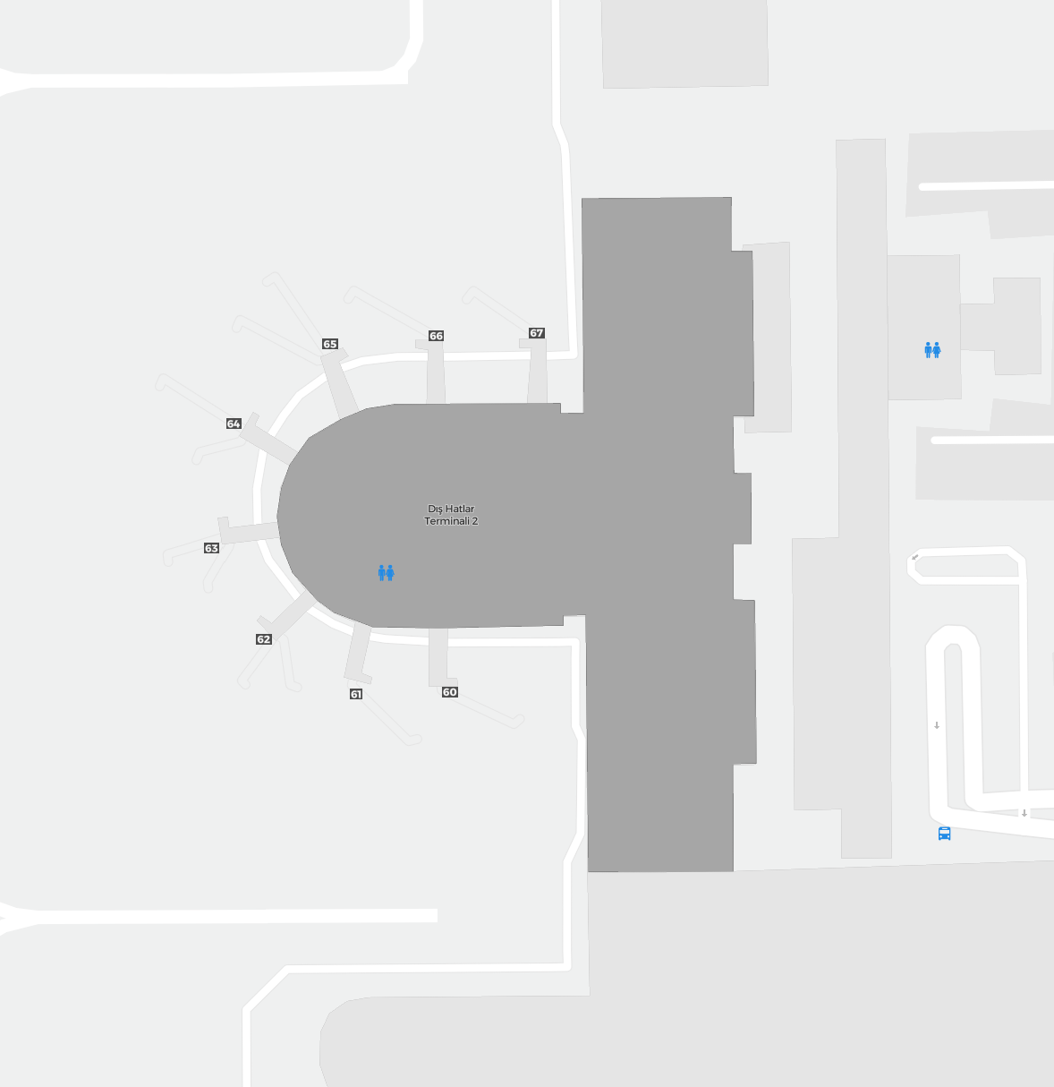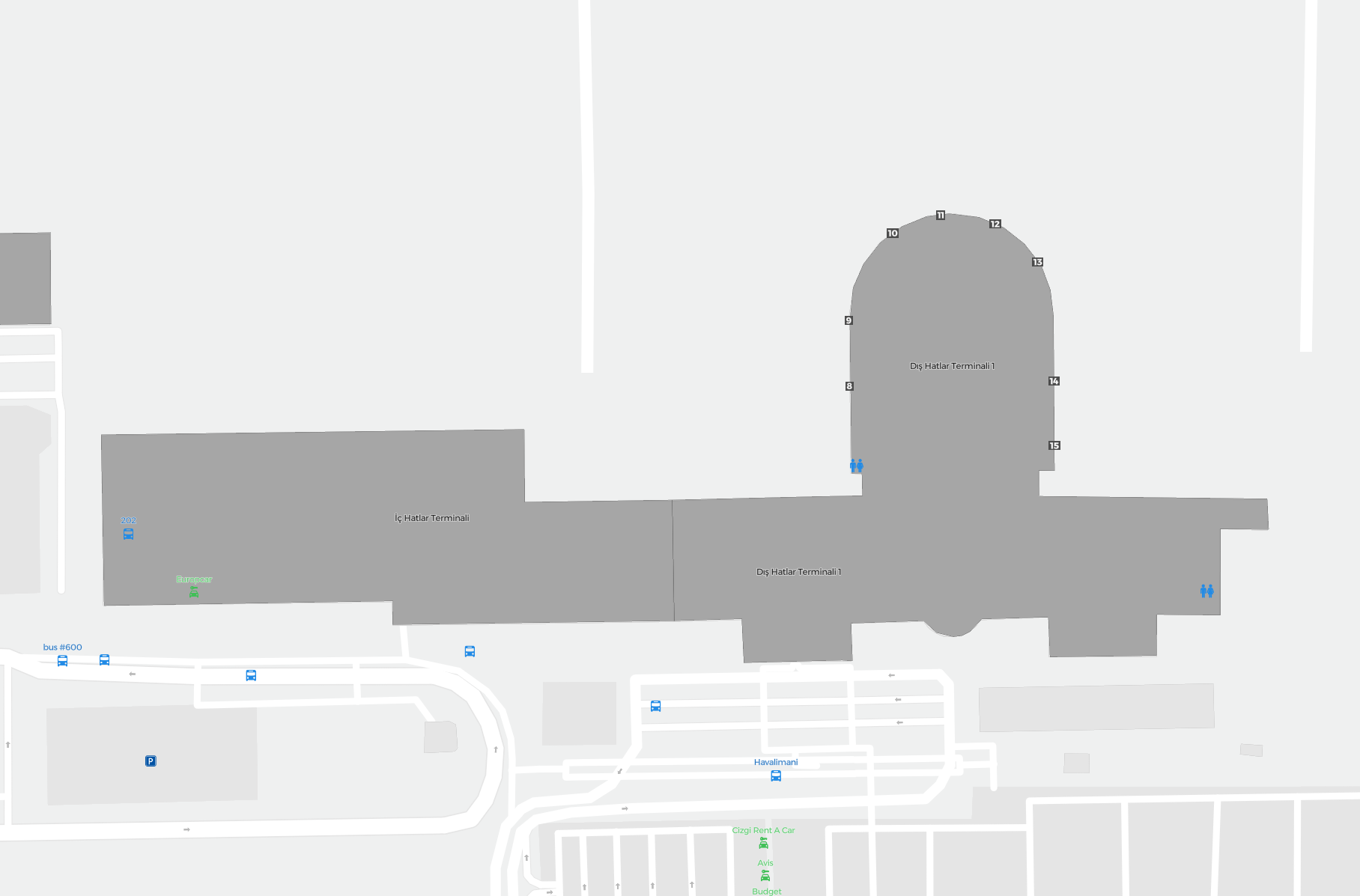 Detta är en zoombar karta över Antalya (AYT). Kartan visar utomhusområden med terminaler och parkeringar och – på vissa flygplatser – även detaljer om gate-områden, hyrbilsanläggningar och andra faciliteter när du zoomar in.