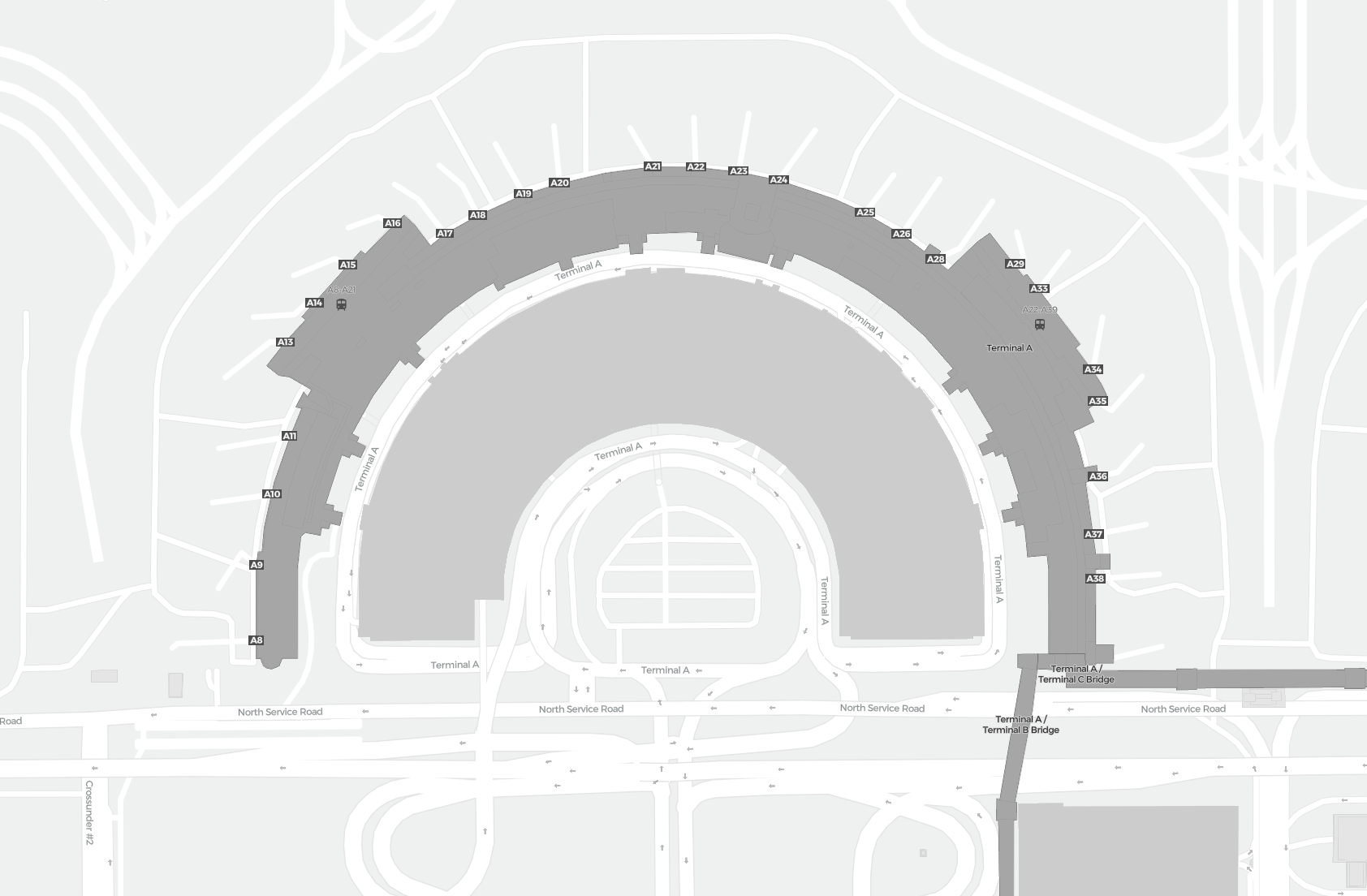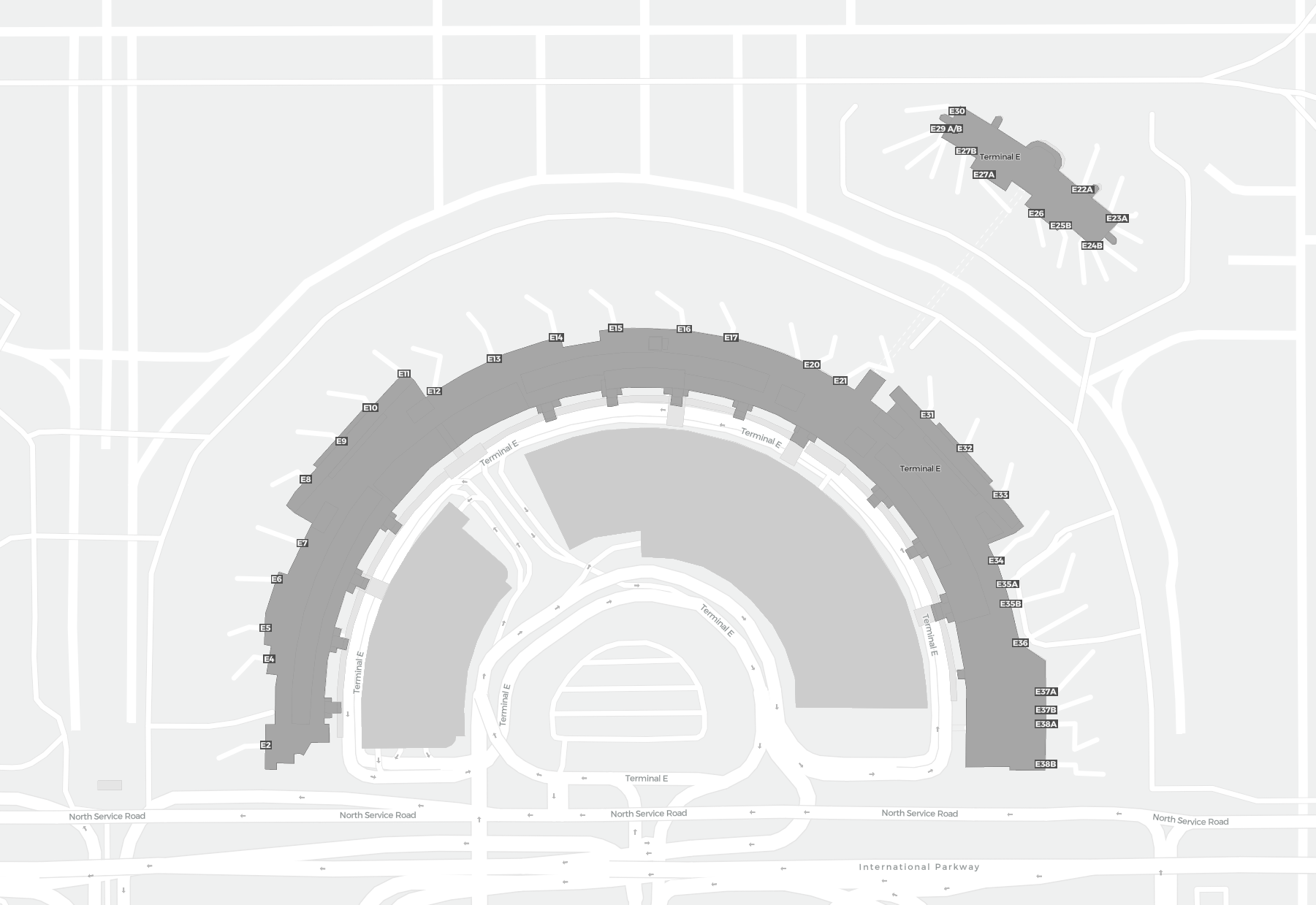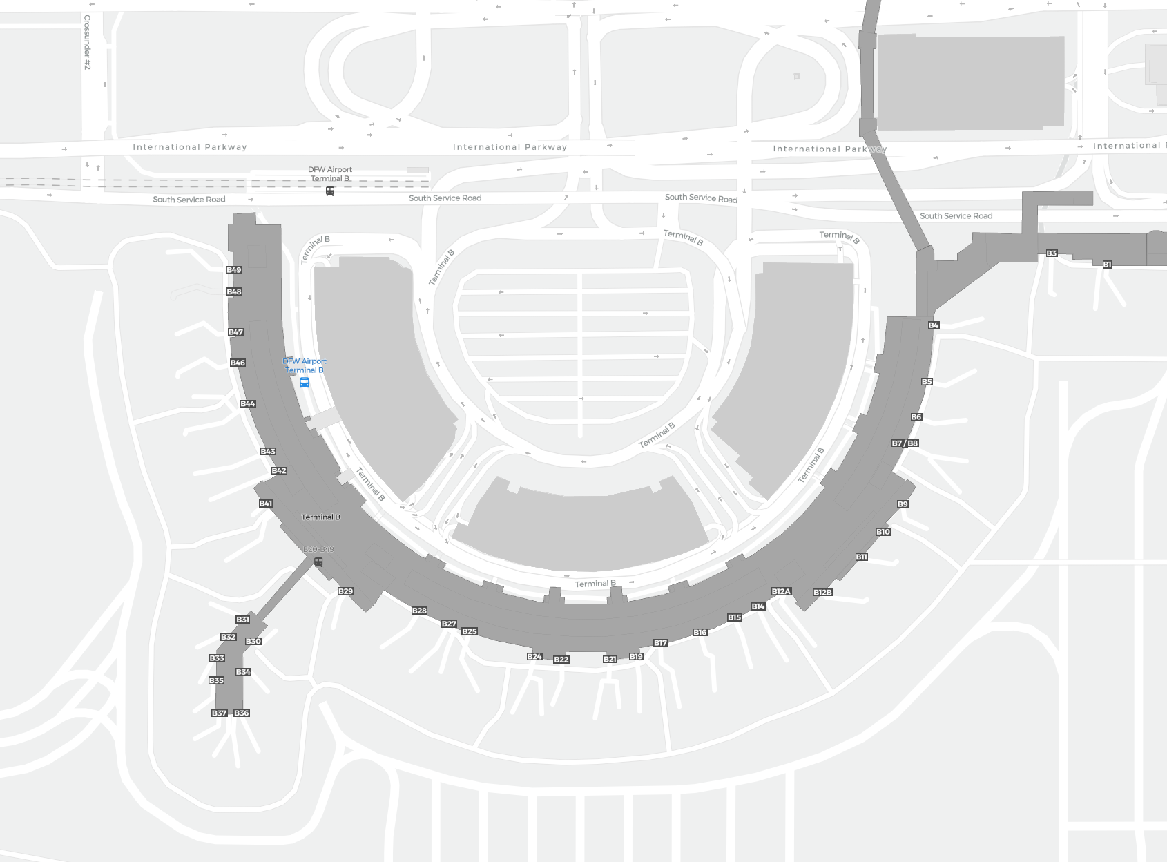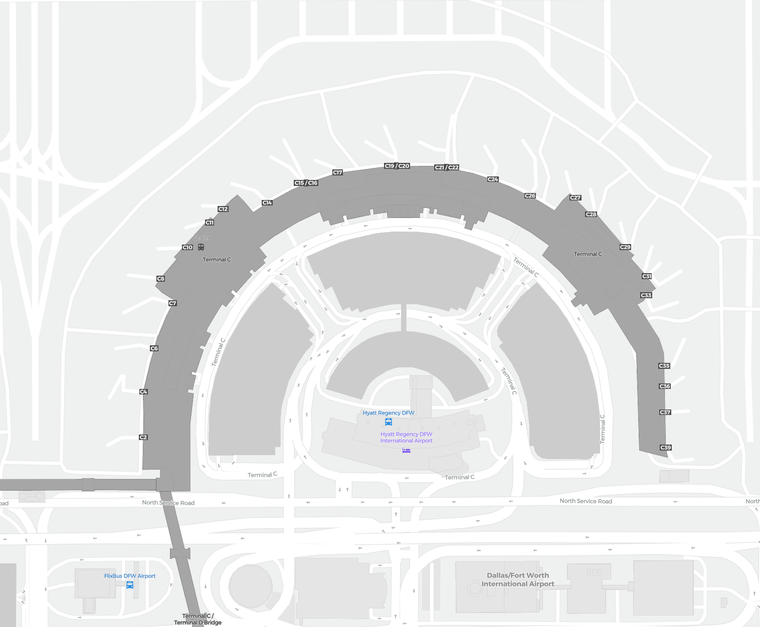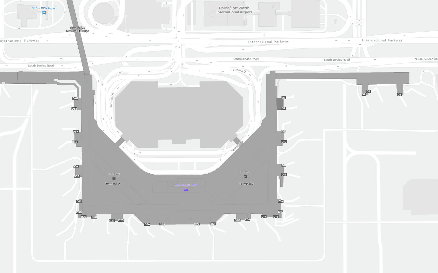 Detta är en zoombar karta över Dallas (DFW). Kartan visar utomhusområden med terminaler och parkeringar och – på vissa flygplatser – även detaljer om gate-områden, hyrbilsanläggningar och andra faciliteter när du zoomar in.