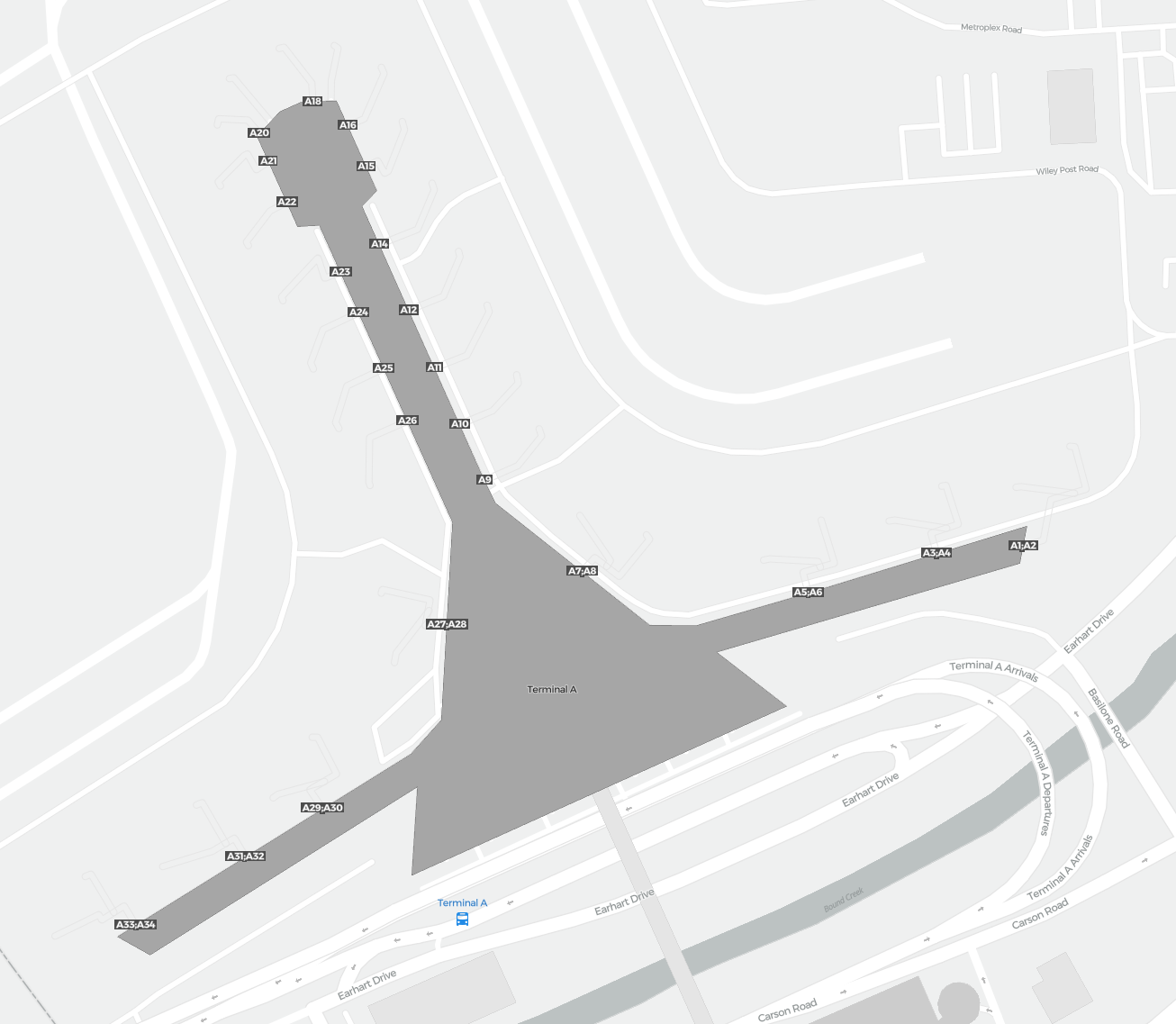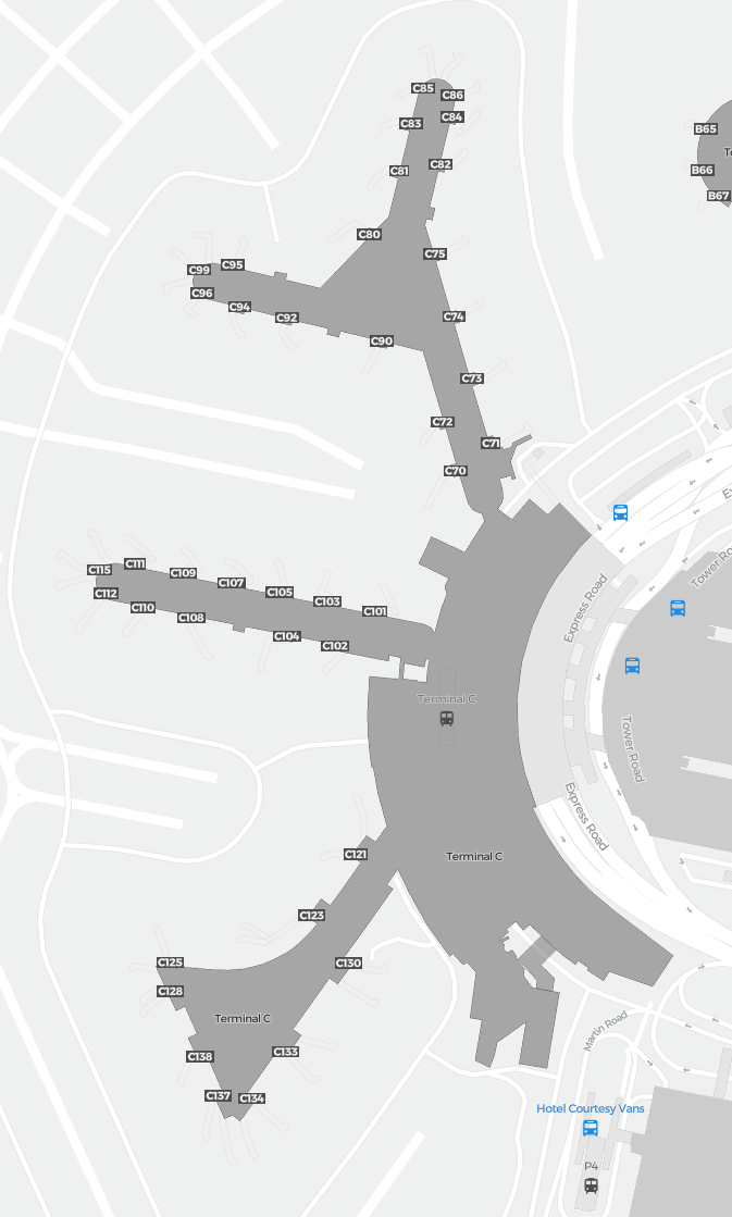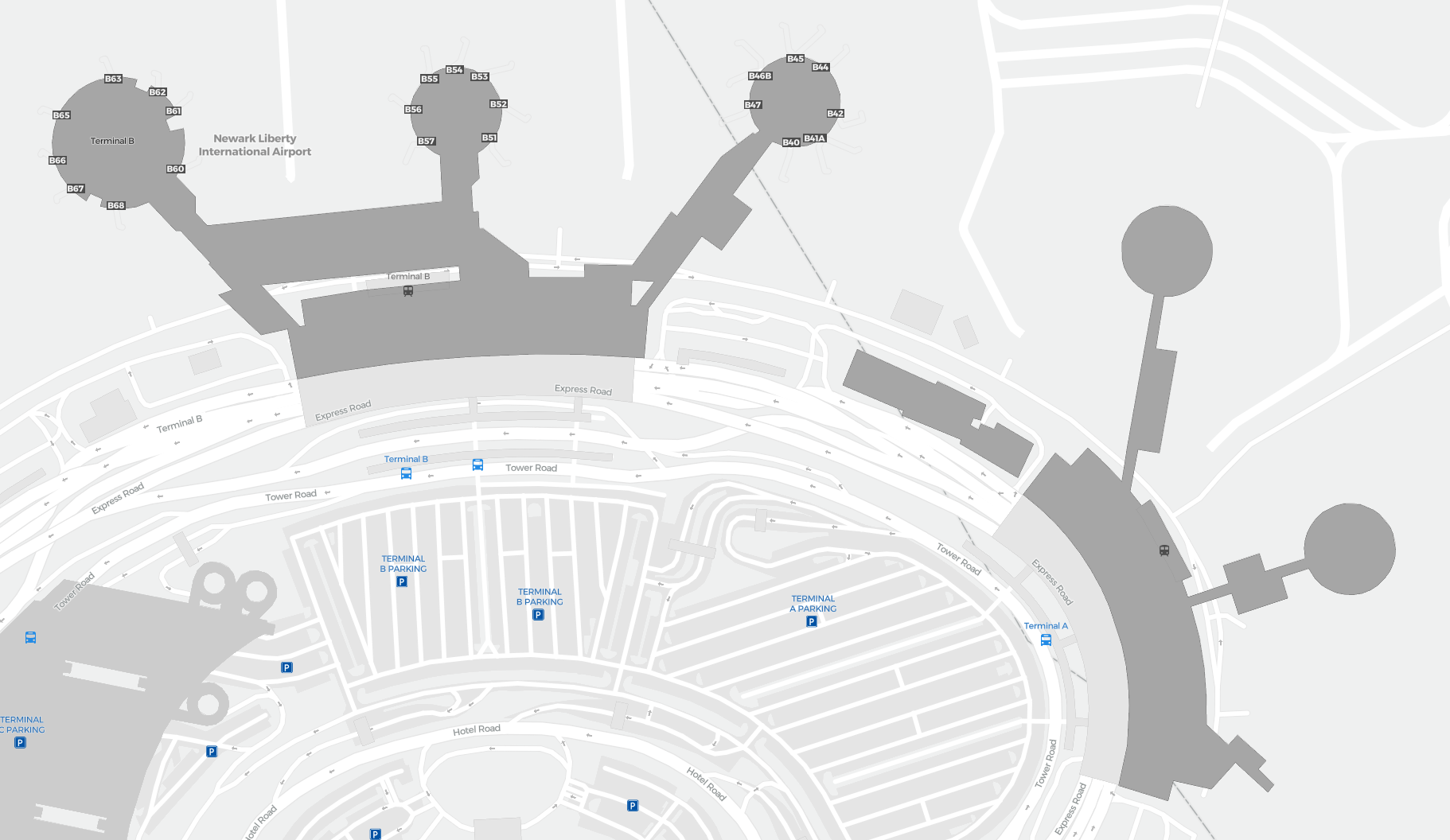 Detta är en zoombar karta över Newark (EWR). Kartan visar utomhusområden med terminaler och parkeringar och – på vissa flygplatser – även detaljer om gate-områden, hyrbilsanläggningar och andra faciliteter när du zoomar in.