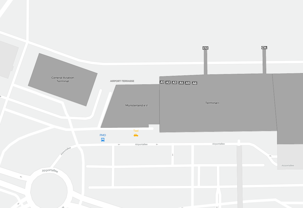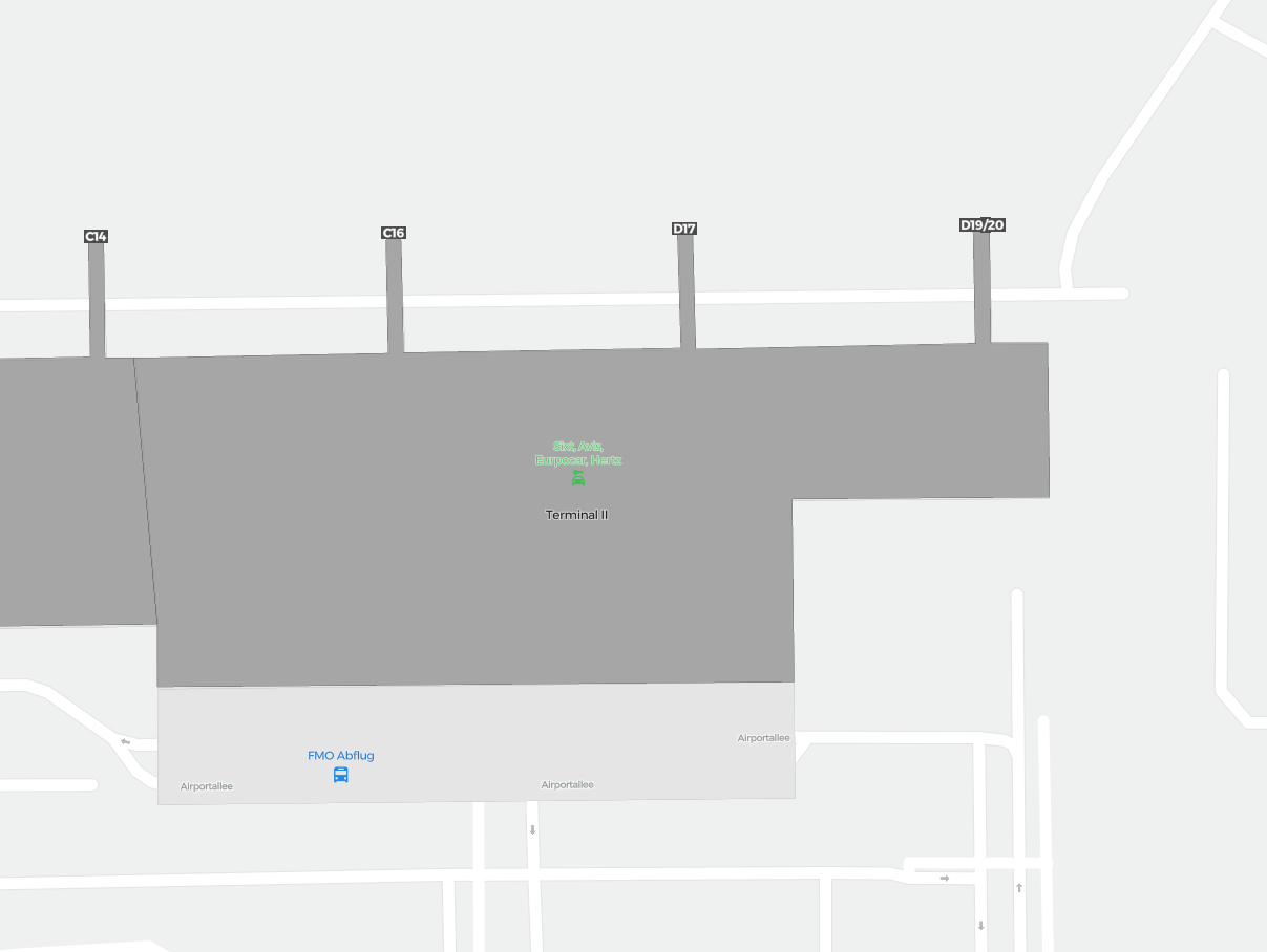 Detta är en zoombar karta över Munster (FMO). Kartan visar utomhusområden med terminaler och parkeringar och – på vissa flygplatser – även detaljer om gate-områden, hyrbilsanläggningar och andra faciliteter när du zoomar in.