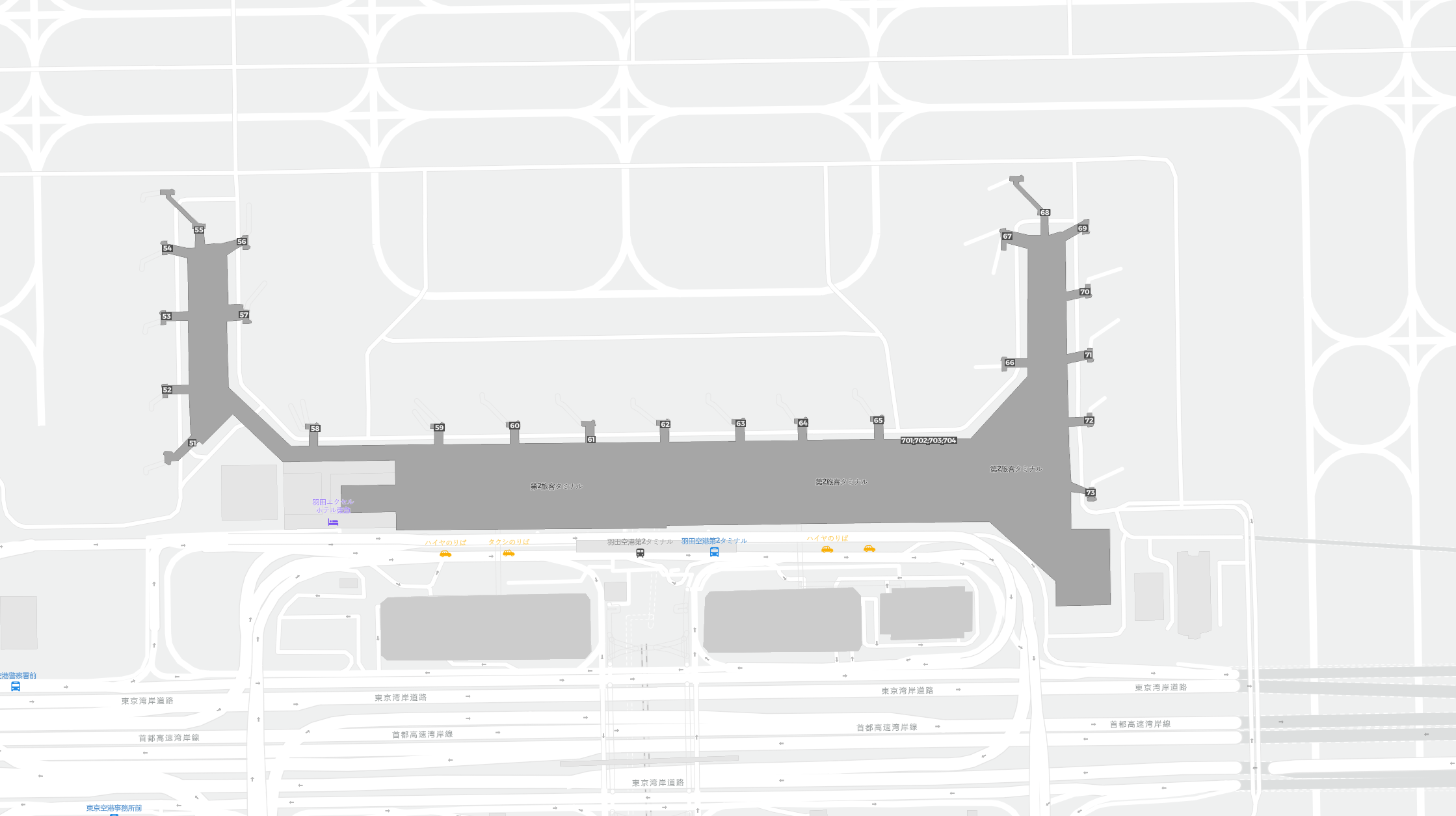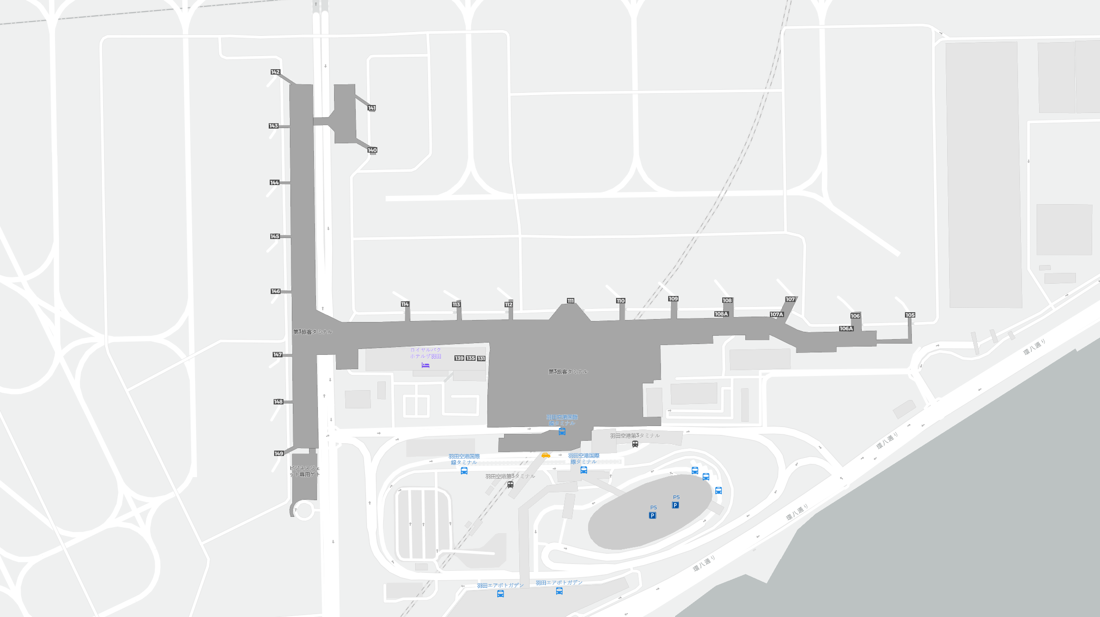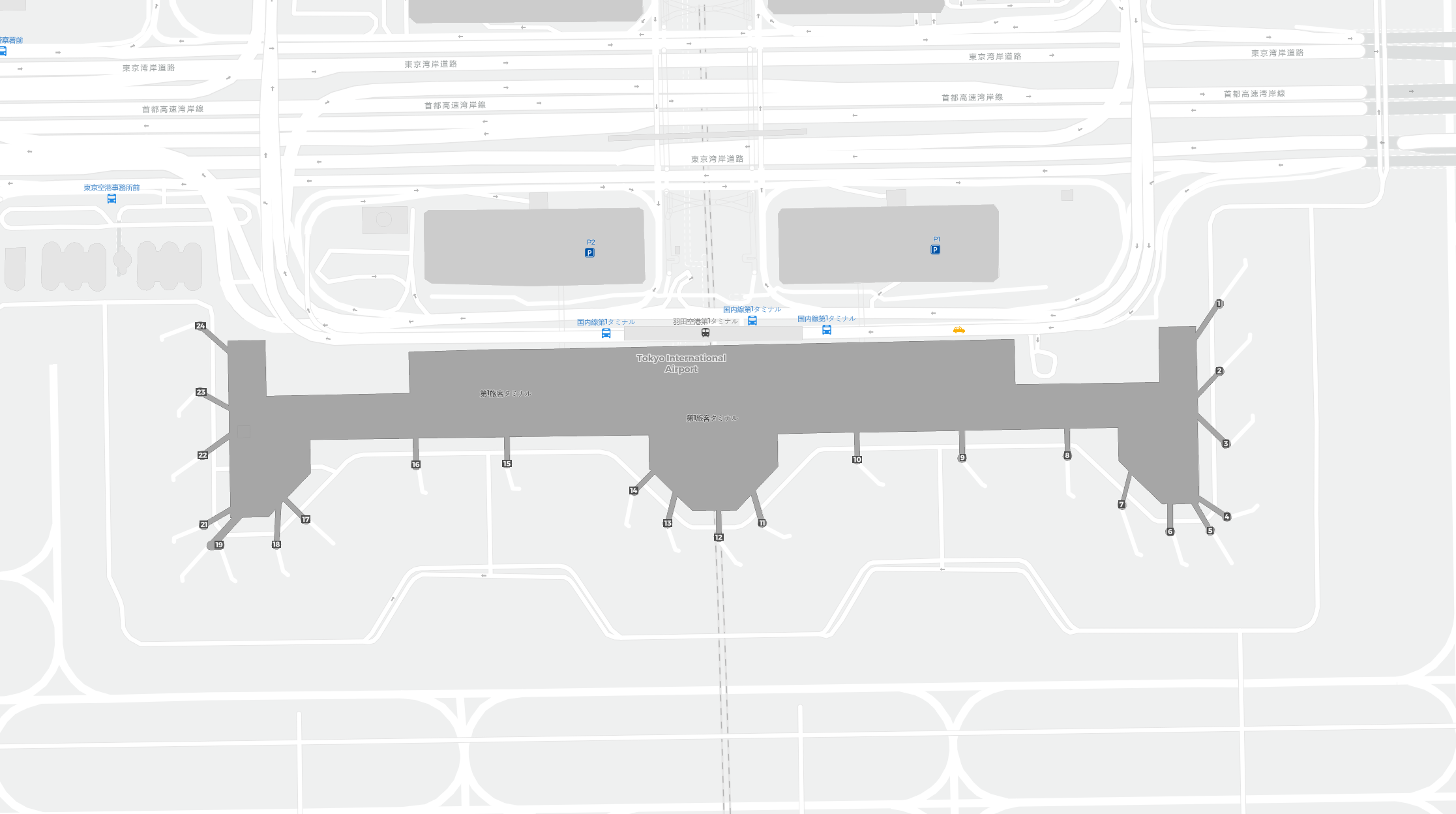 Detta är en zoombar karta över Tokyo (HND). Kartan visar utomhusområden med terminaler och parkeringar och – på vissa flygplatser – även detaljer om gate-områden, hyrbilsanläggningar och andra faciliteter när du zoomar in.