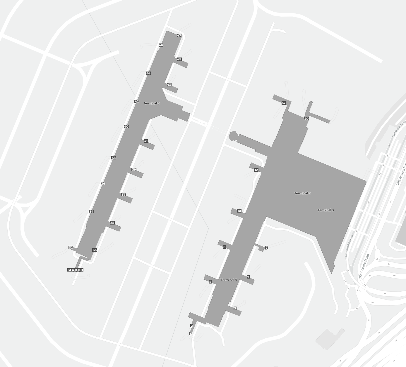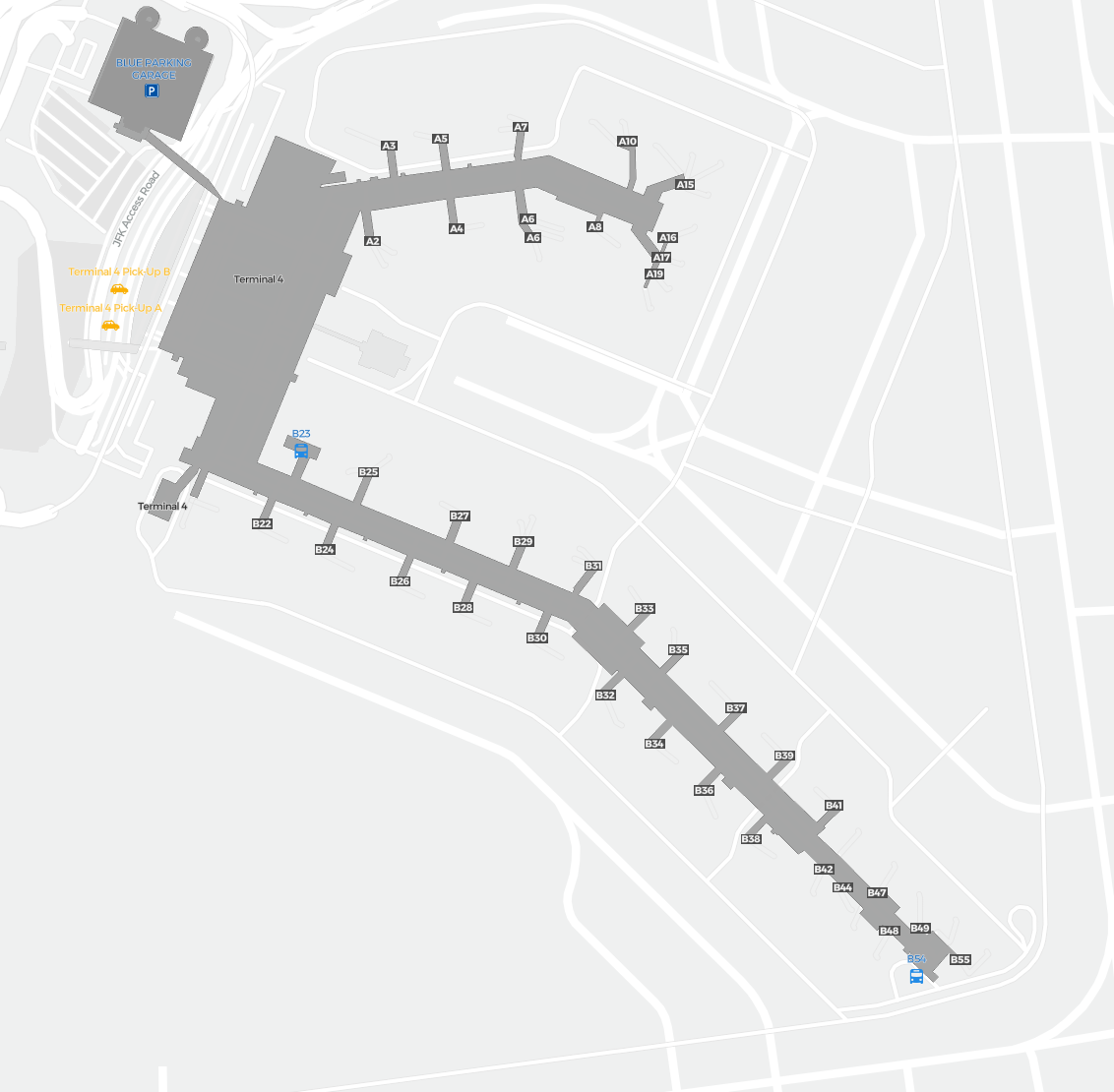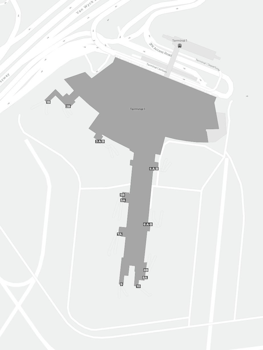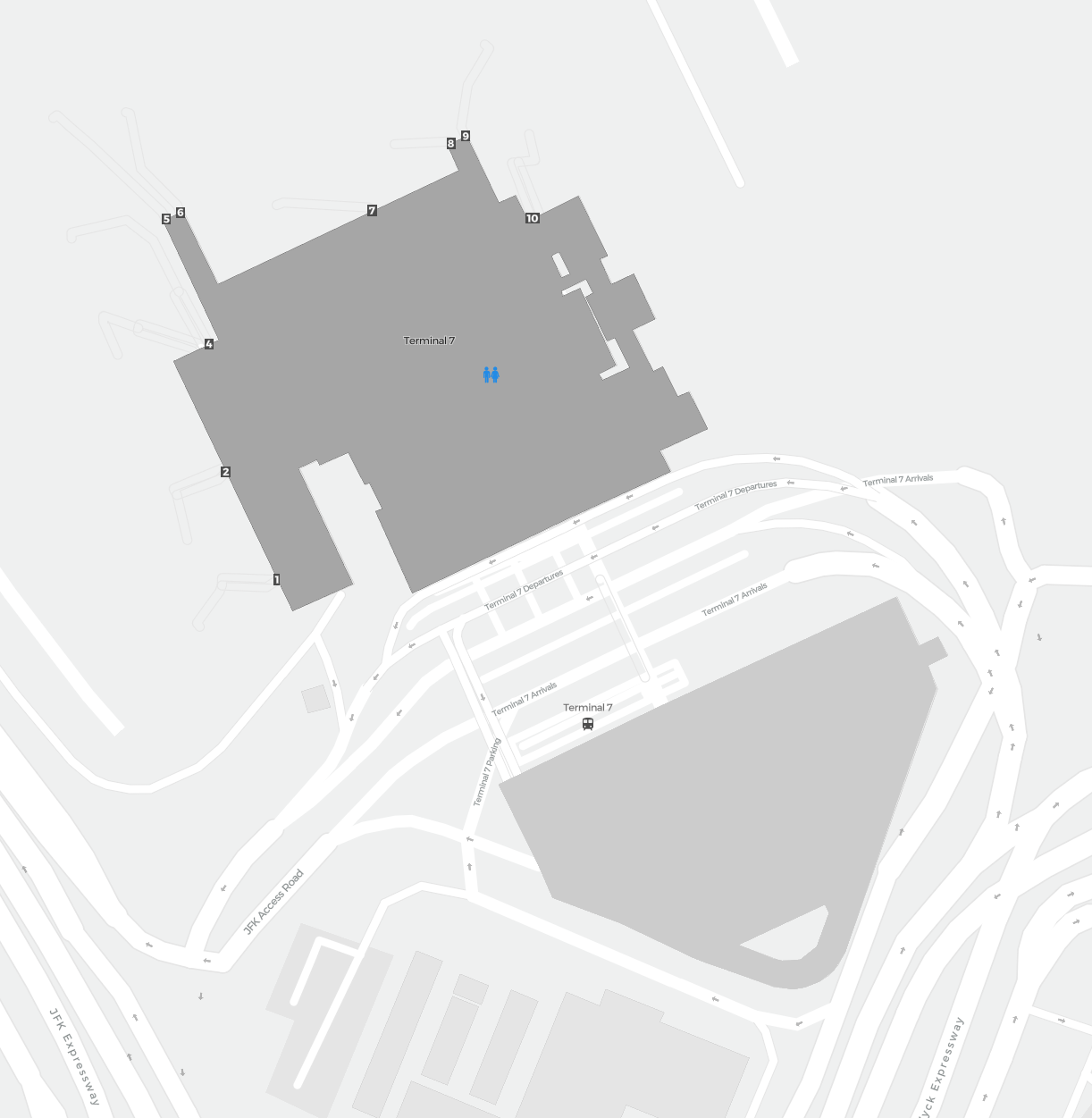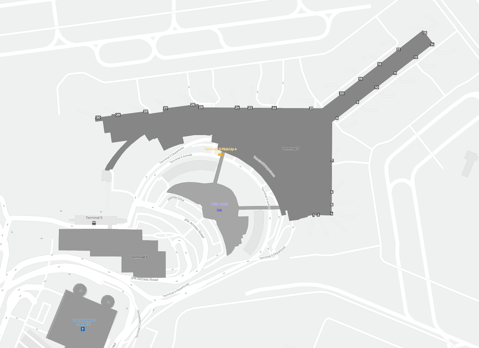 Detta är en zoombar karta över New York (JFK). Kartan visar utomhusområden med terminaler och parkeringar och – på vissa flygplatser – även detaljer om gate-områden, hyrbilsanläggningar och andra faciliteter när du zoomar in.