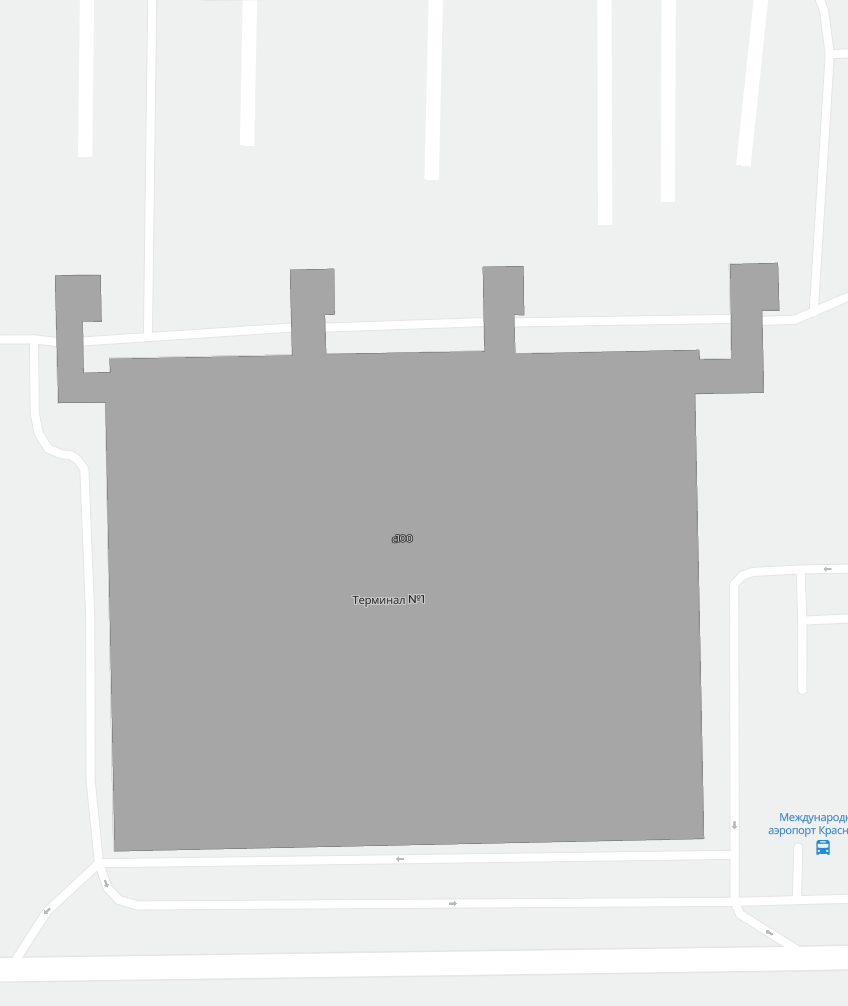 Detta är en zoombar karta över Krasnoyarsk (KJA). Kartan visar utomhusområden med terminaler och parkeringar och – på vissa flygplatser – även detaljer om gate-områden, hyrbilsanläggningar och andra faciliteter när du zoomar in.