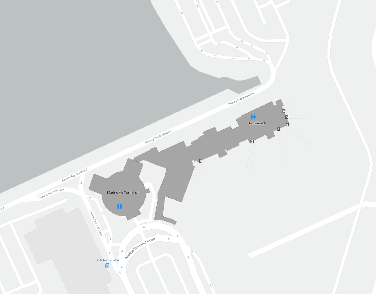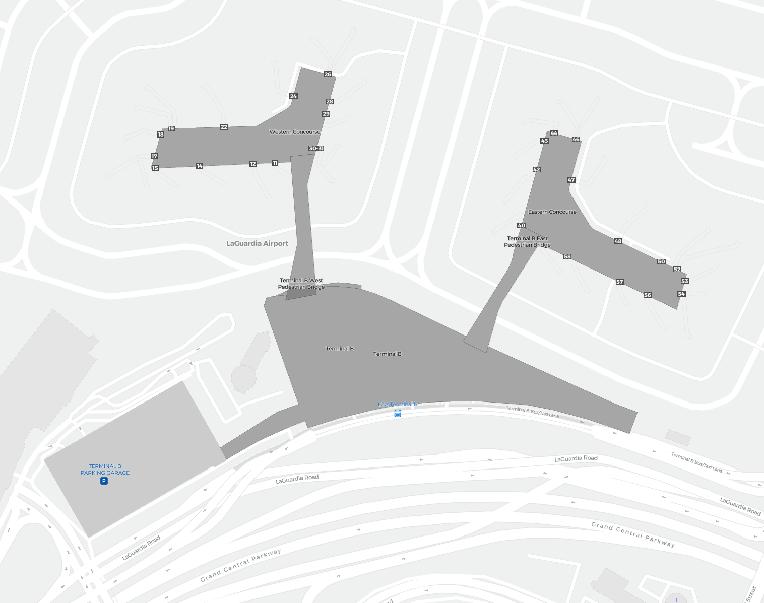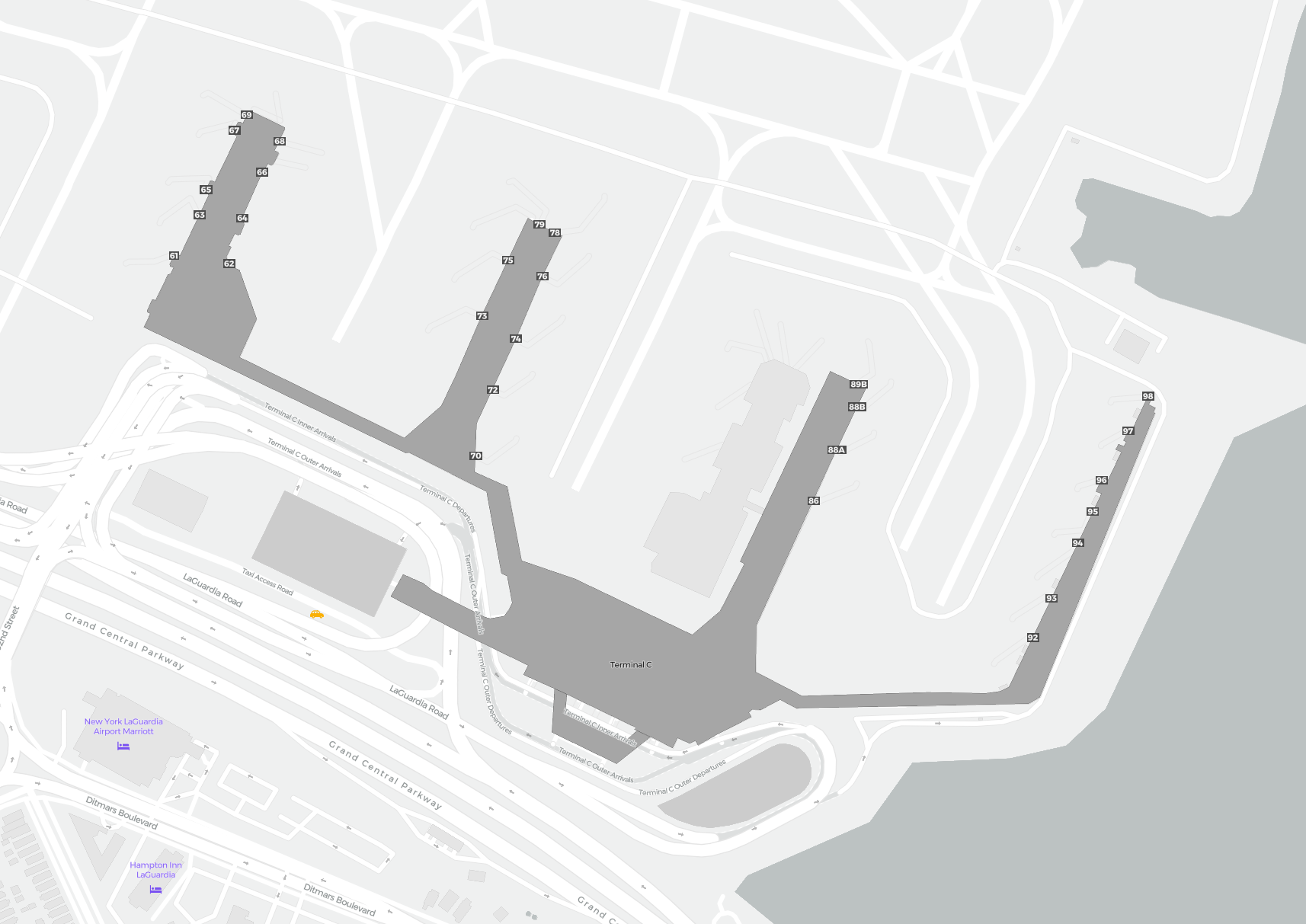 Detta är en zoombar karta över New York (LGA). Kartan visar utomhusområden med terminaler och parkeringar och – på vissa flygplatser – även detaljer om gate-områden, hyrbilsanläggningar och andra faciliteter när du zoomar in.