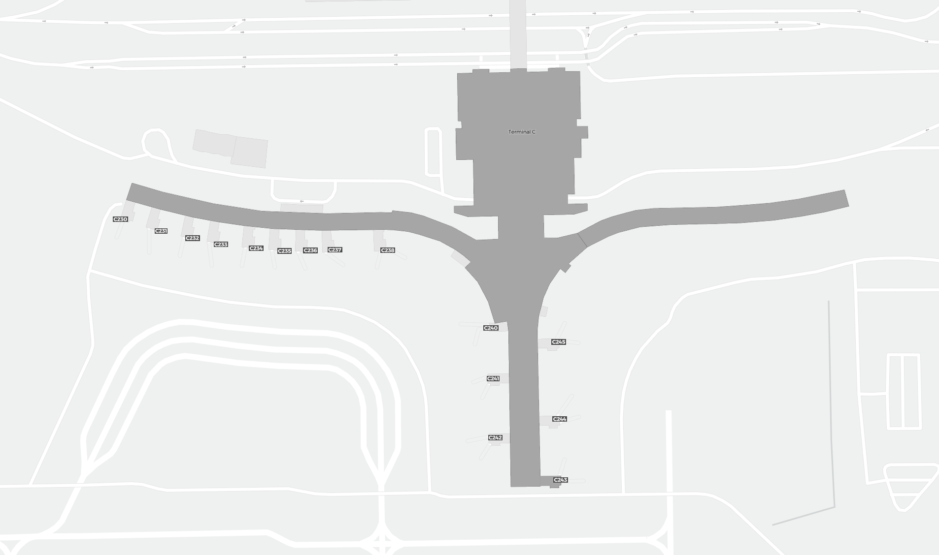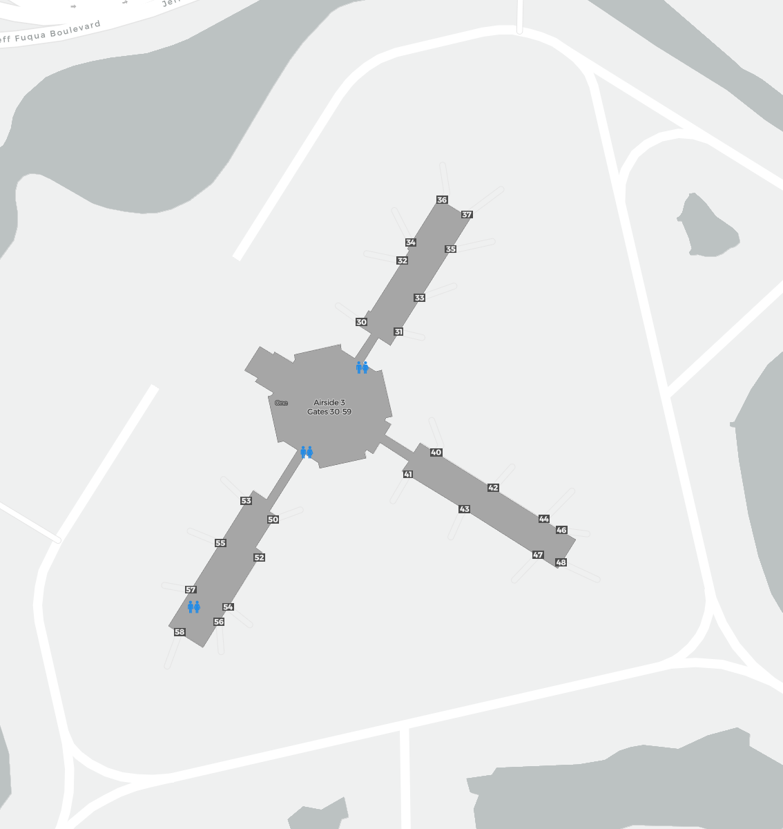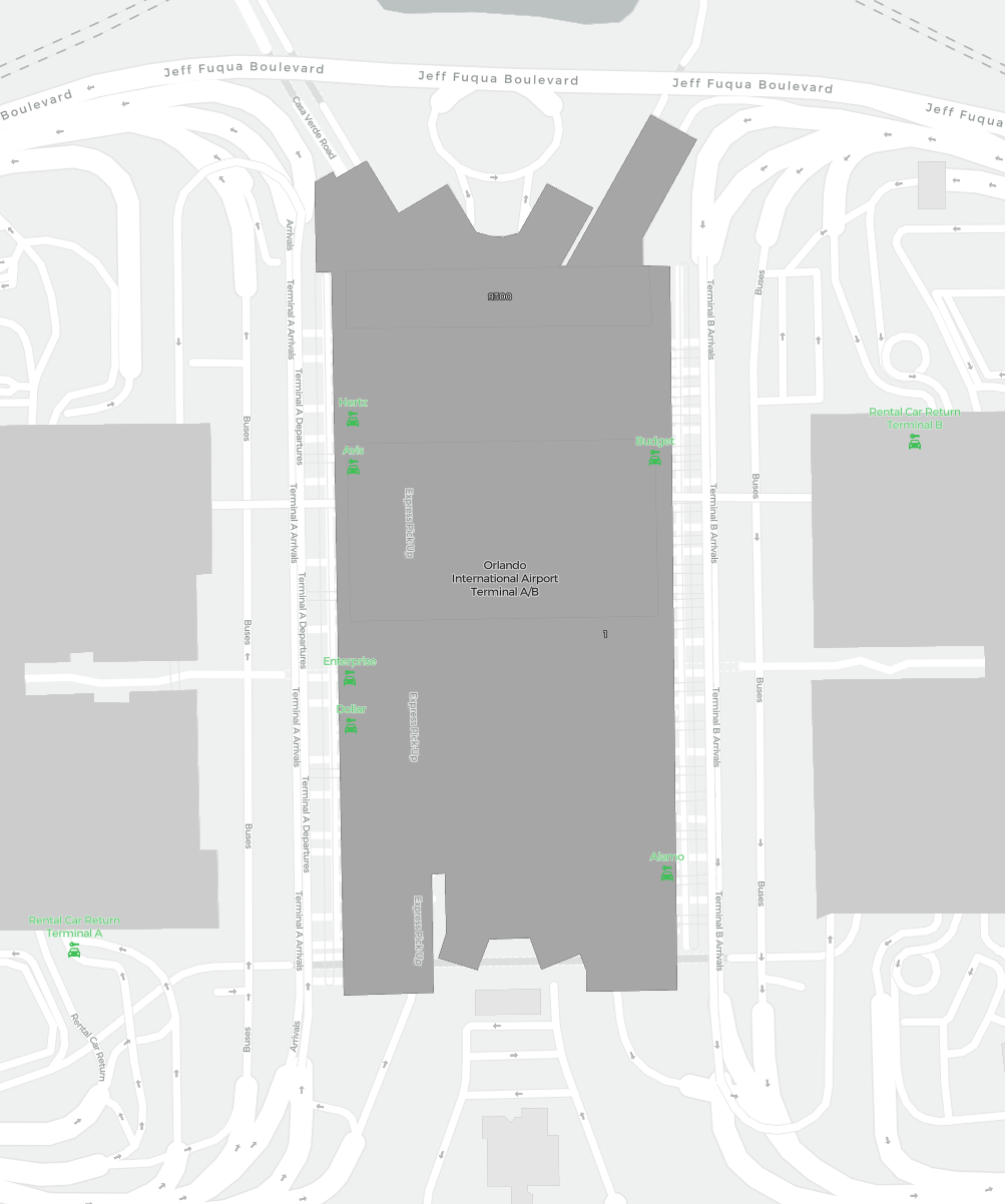Detta är en zoombar karta över Orlando (MCO). Kartan visar utomhusområden med terminaler och parkeringar och – på vissa flygplatser – även detaljer om gate-områden, hyrbilsanläggningar och andra faciliteter när du zoomar in.