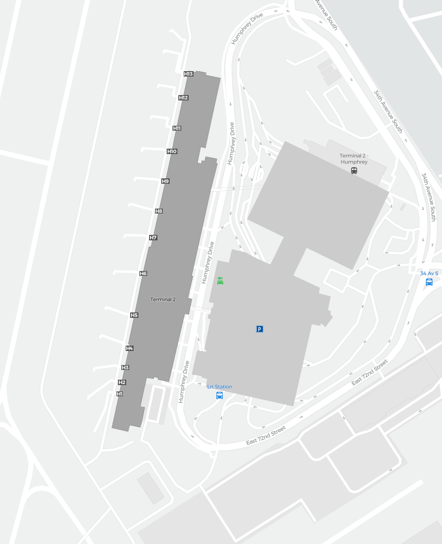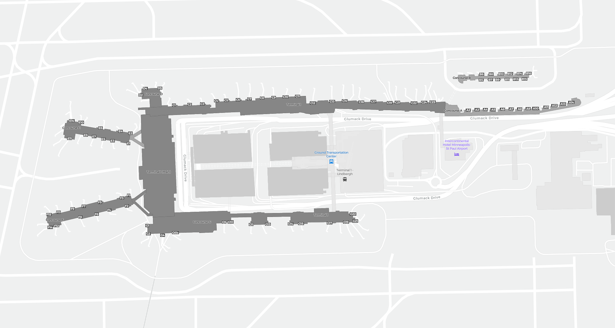 Detta är en zoombar karta över Minneapolis (MSP). Kartan visar utomhusområden med terminaler och parkeringar och – på vissa flygplatser – även detaljer om gate-områden, hyrbilsanläggningar och andra faciliteter när du zoomar in.