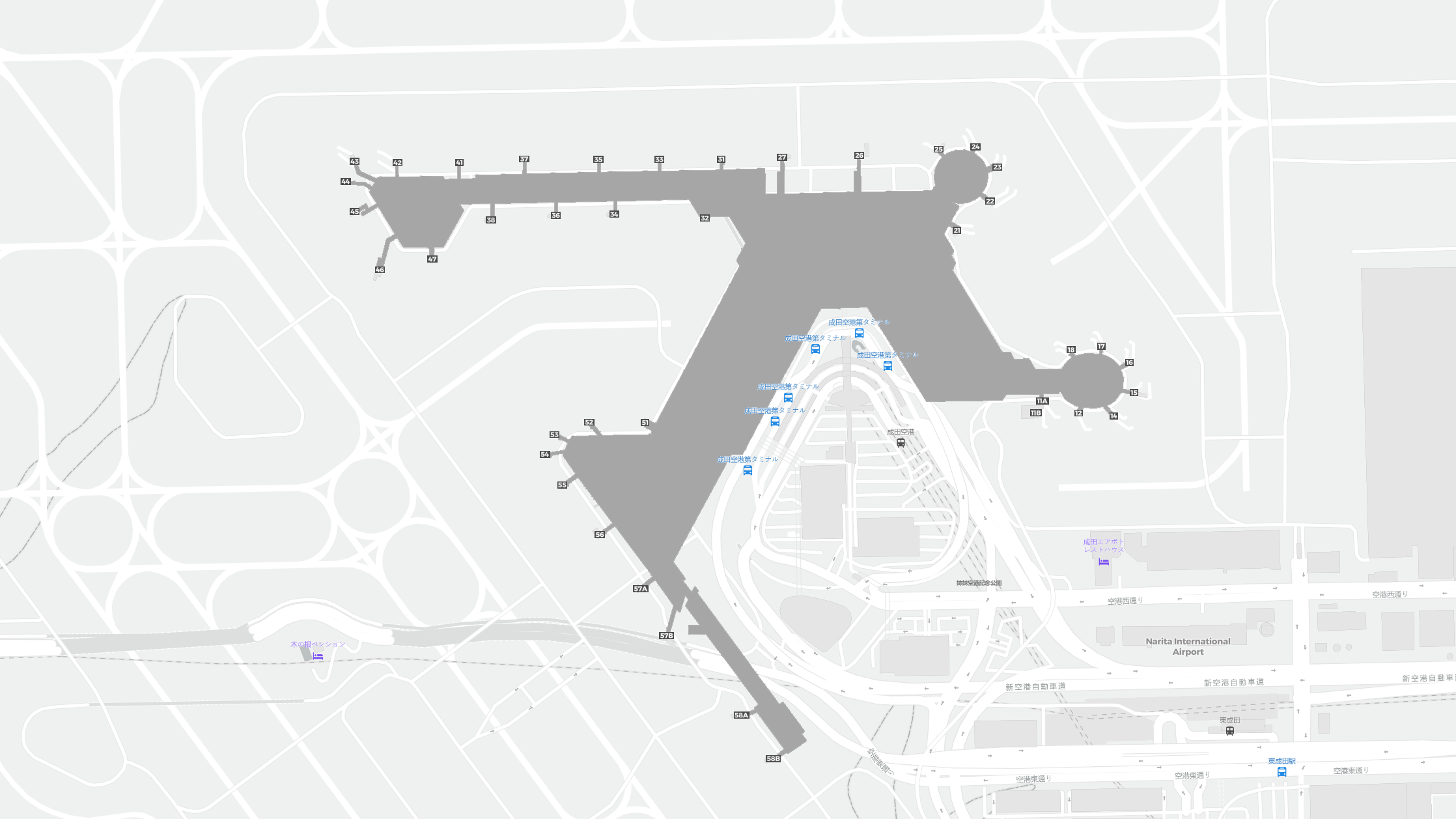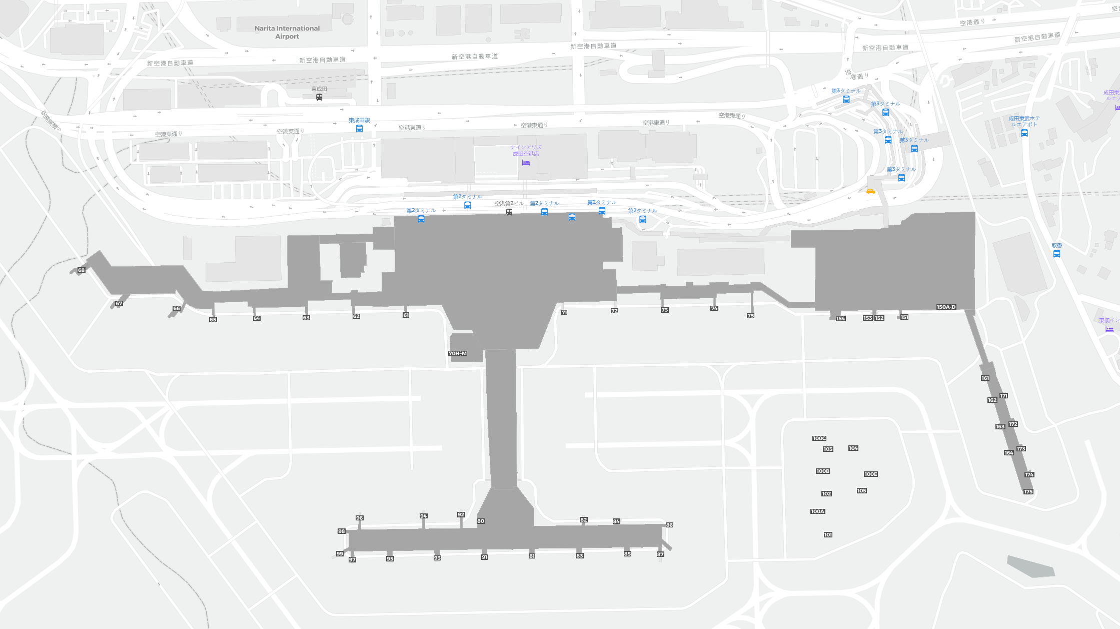 Detta är en zoombar karta över Tokyo (NRT). Kartan visar utomhusområden med terminaler och parkeringar och – på vissa flygplatser – även detaljer om gate-områden, hyrbilsanläggningar och andra faciliteter när du zoomar in.