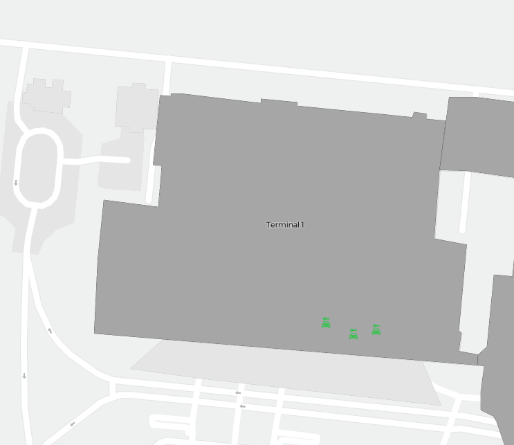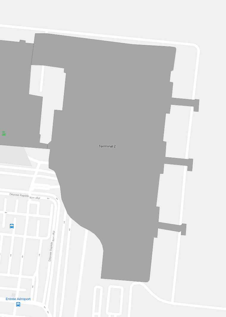 Detta är en zoombar karta över Marrakech (RAK). Kartan visar utomhusområden med terminaler och parkeringar och – på vissa flygplatser – även detaljer om gate-områden, hyrbilsanläggningar och andra faciliteter när du zoomar in.