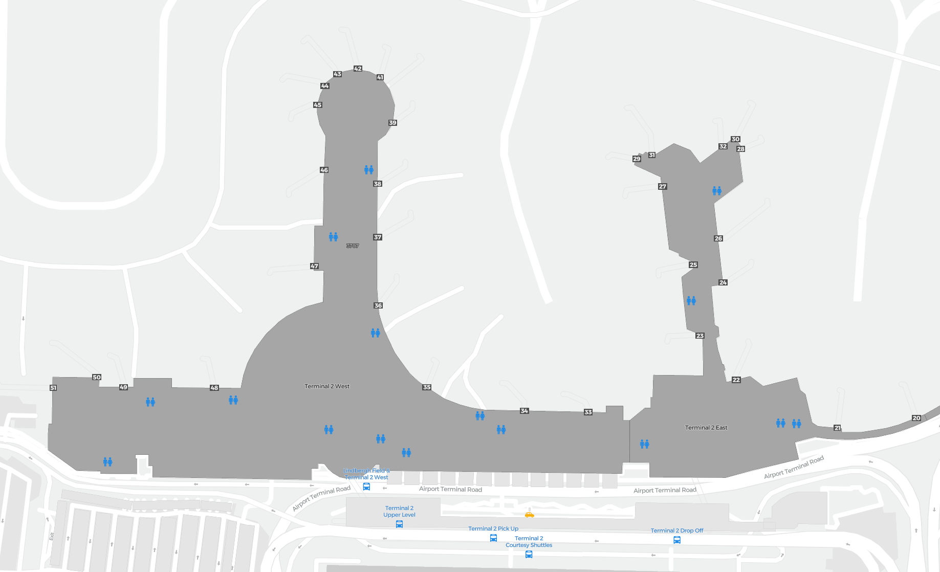 Detta är en zoombar karta över San Diego (SAN). Kartan visar utomhusområden med terminaler och parkeringar och – på vissa flygplatser – även detaljer om gate-områden, hyrbilsanläggningar och andra faciliteter när du zoomar in.