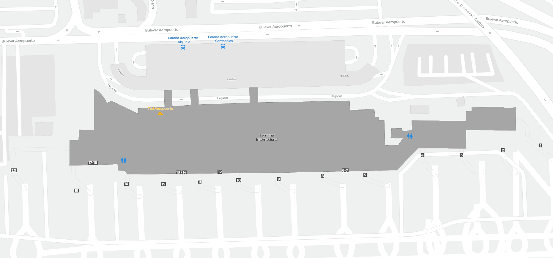 Detta är en zoombar karta över San José (SJO). Kartan visar utomhusområden med terminaler och parkeringar och – på vissa flygplatser – även detaljer om gate-områden, hyrbilsanläggningar och andra faciliteter när du zoomar in.
