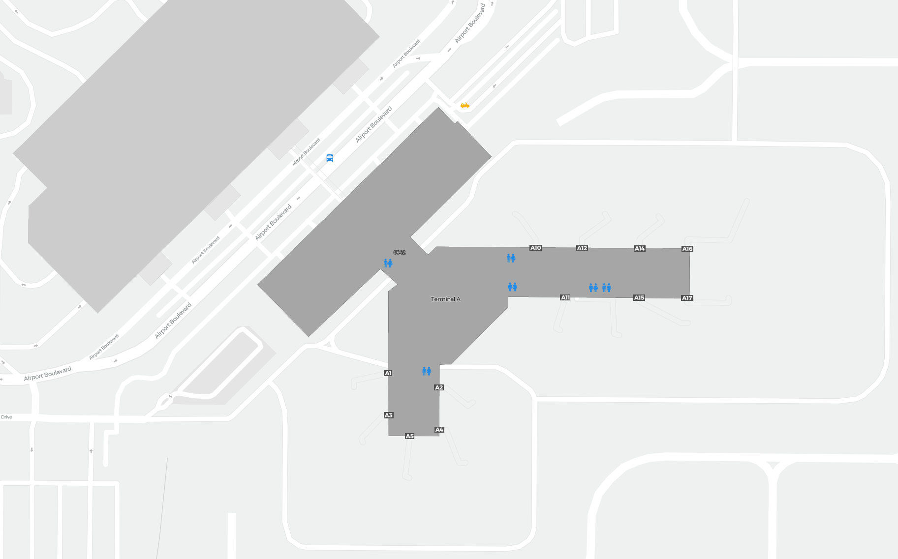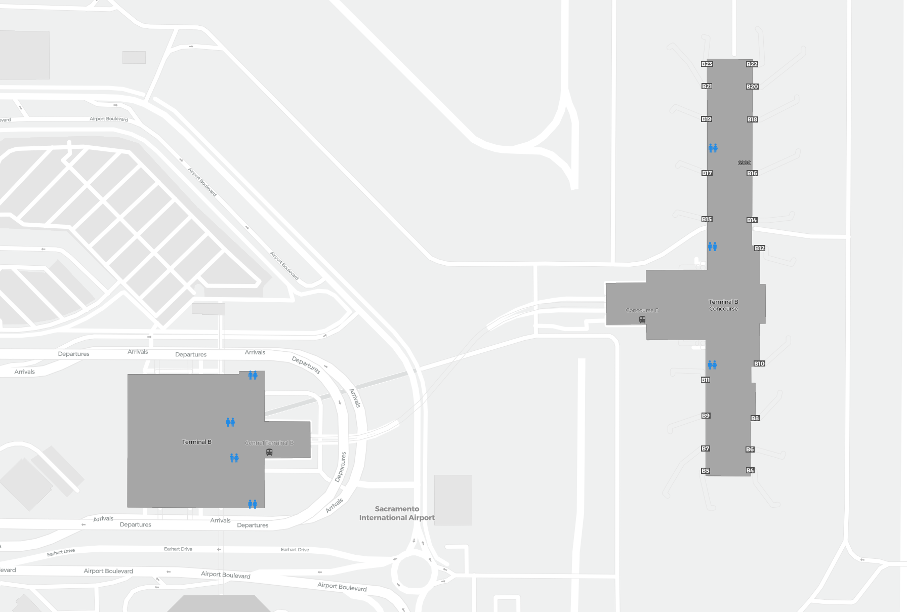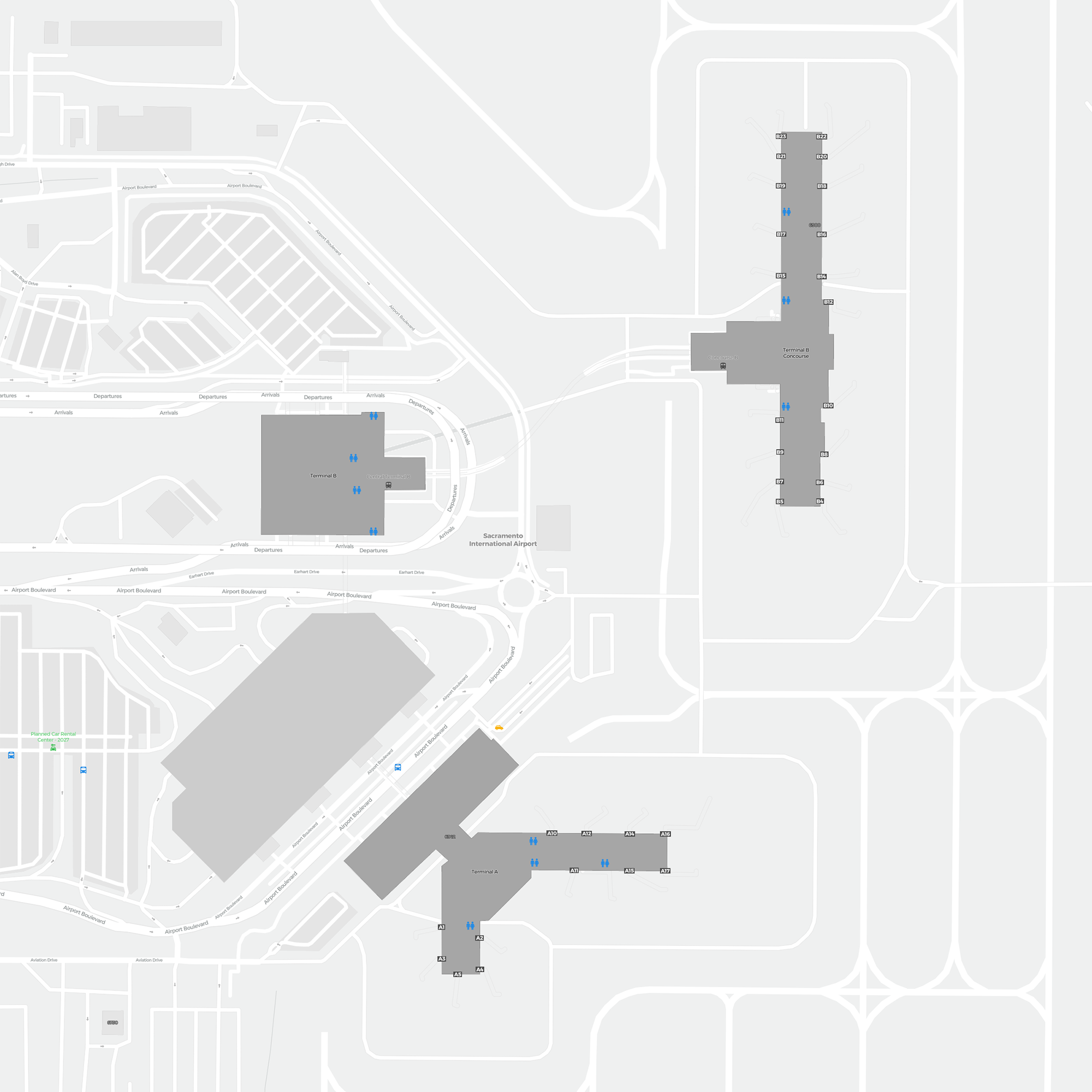 Detta är en zoombar karta över Sacramento (SMF). Kartan visar utomhusområden med terminaler och parkeringar och – på vissa flygplatser – även detaljer om gate-områden, hyrbilsanläggningar och andra faciliteter när du zoomar in.