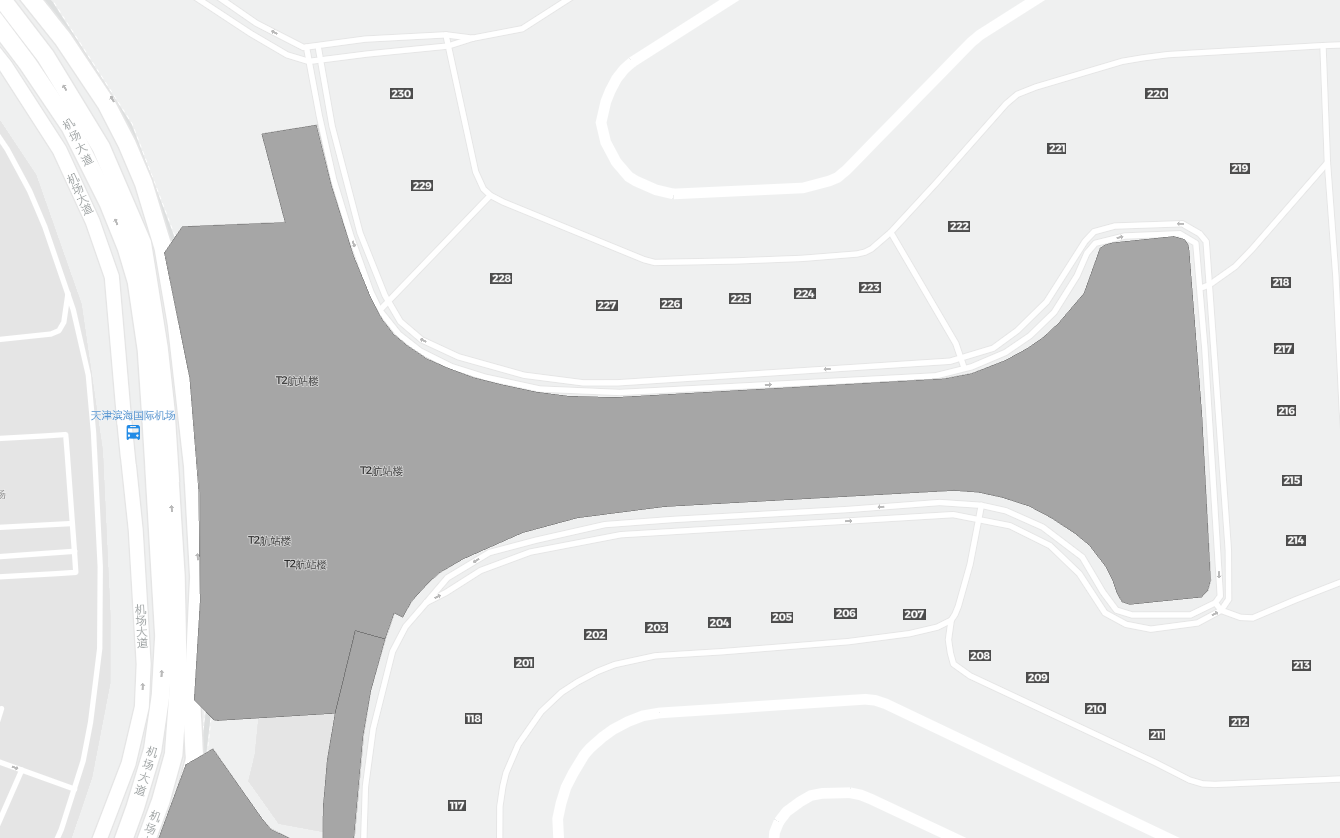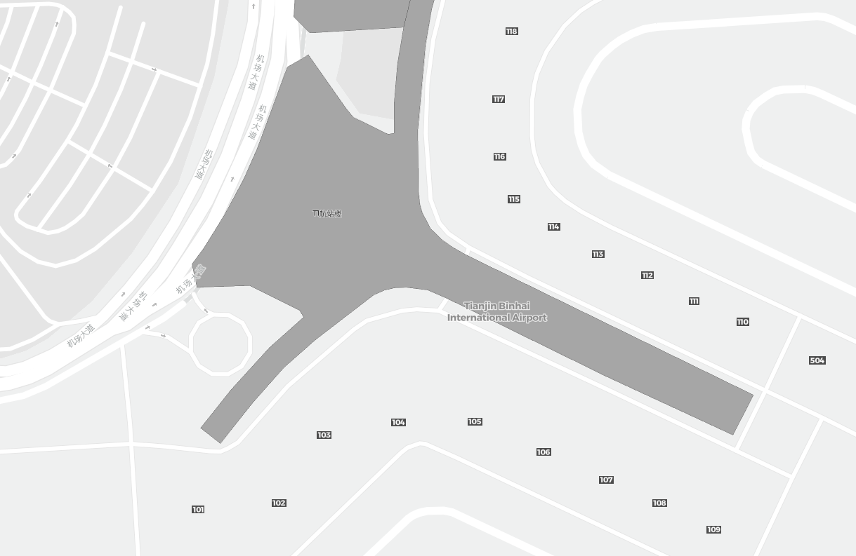 Detta är en zoombar karta över Tianjin (TSN). Kartan visar utomhusområden med terminaler och parkeringar och – på vissa flygplatser – även detaljer om gate-områden, hyrbilsanläggningar och andra faciliteter när du zoomar in.