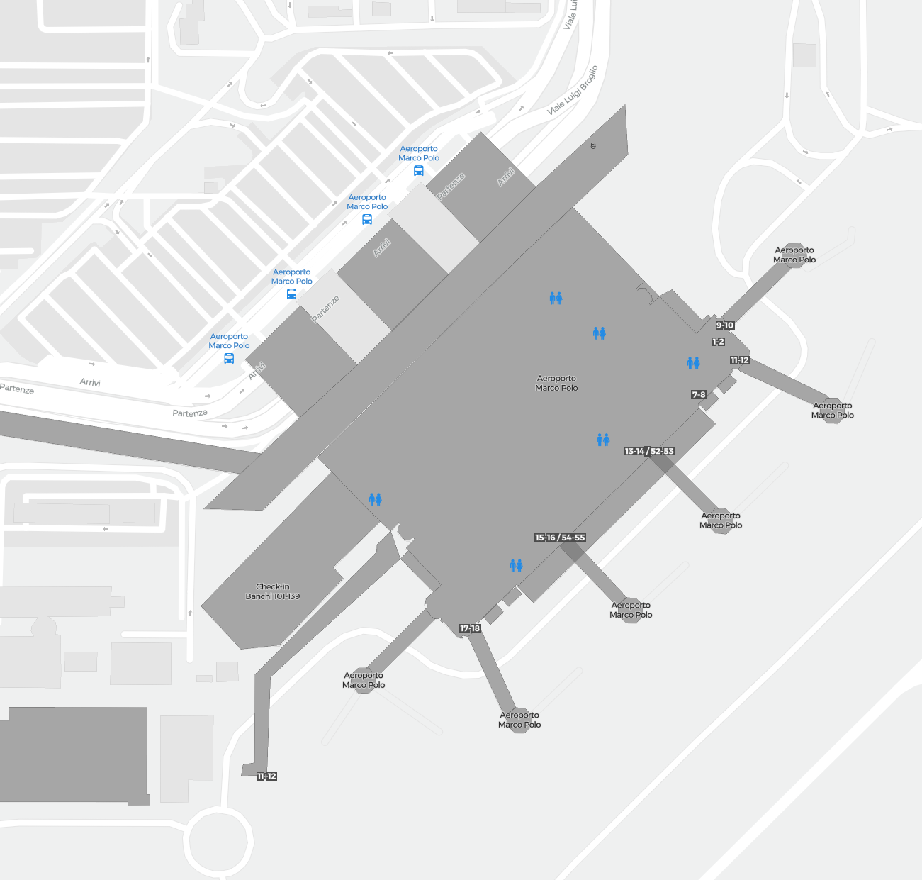 Detta är en zoombar karta över Venedig (VCE). Kartan visar utomhusområden med terminaler och parkeringar och – på vissa flygplatser – även detaljer om gate-områden, hyrbilsanläggningar och andra faciliteter när du zoomar in.